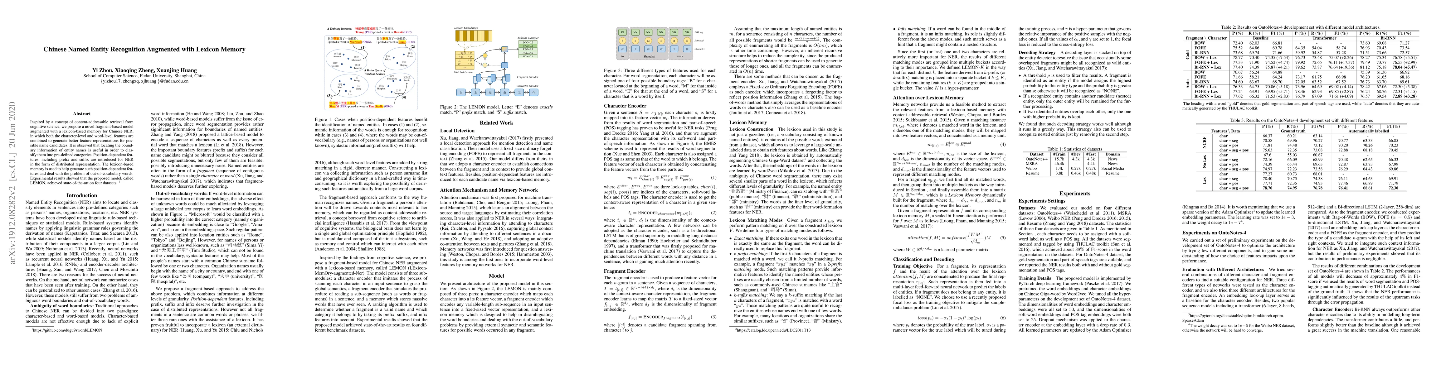 This paper proposes a novel fragment-based model called LEMON for Chinese Named Entity Recognition (NER) that integrates lexicon memory to enhance feature representations. The model combines character-level and word-level features, including position-dependent features, and achieves state-of-the-art performance on four datasets.