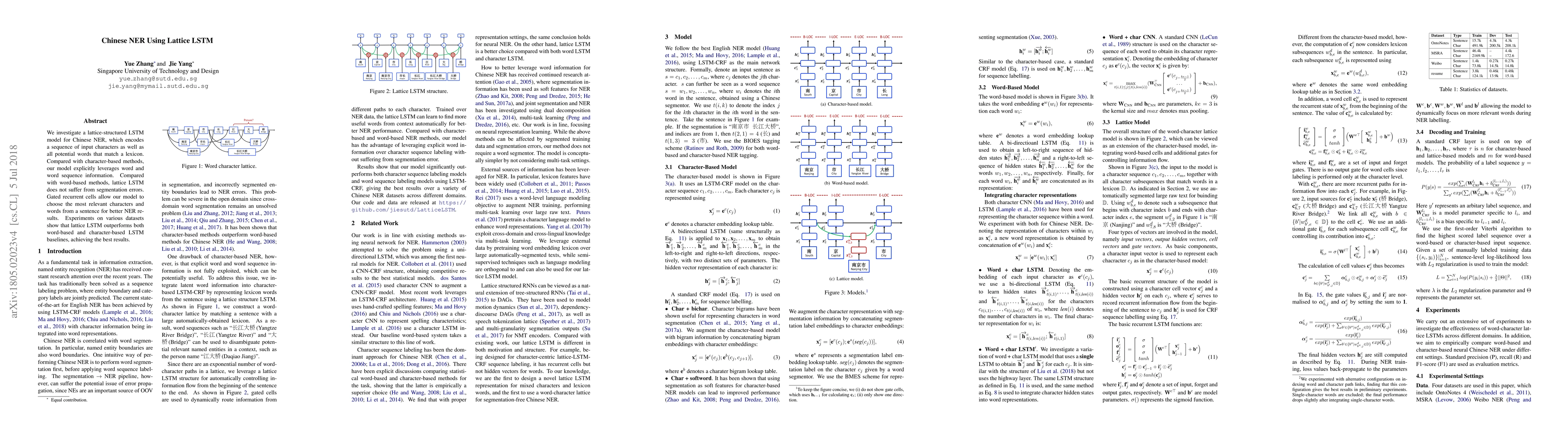 This paper proposes a lattice-structured LSTM model for Chinese Named Entity Recognition (NER) that combines character and word sequence information, outperforming both character-based and word-based methods. The model leverages gated recurrent cells to select the most relevant characters and words, achieving superior NER results.