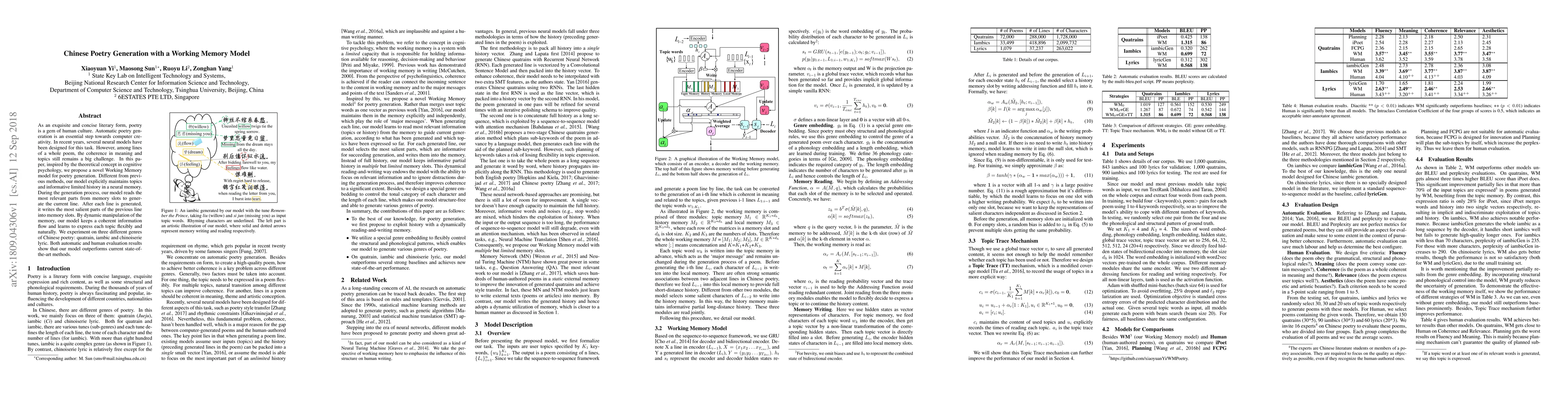 This paper proposes a Working Memory model to enhance coherence in automatic Chinese poetry generation, addressing the challenge of maintaining thematic consistency across lines. The model dynamically updates a neural memory to store salient parts of previous lines, aiding in generating coherent and topically relevant new lines.