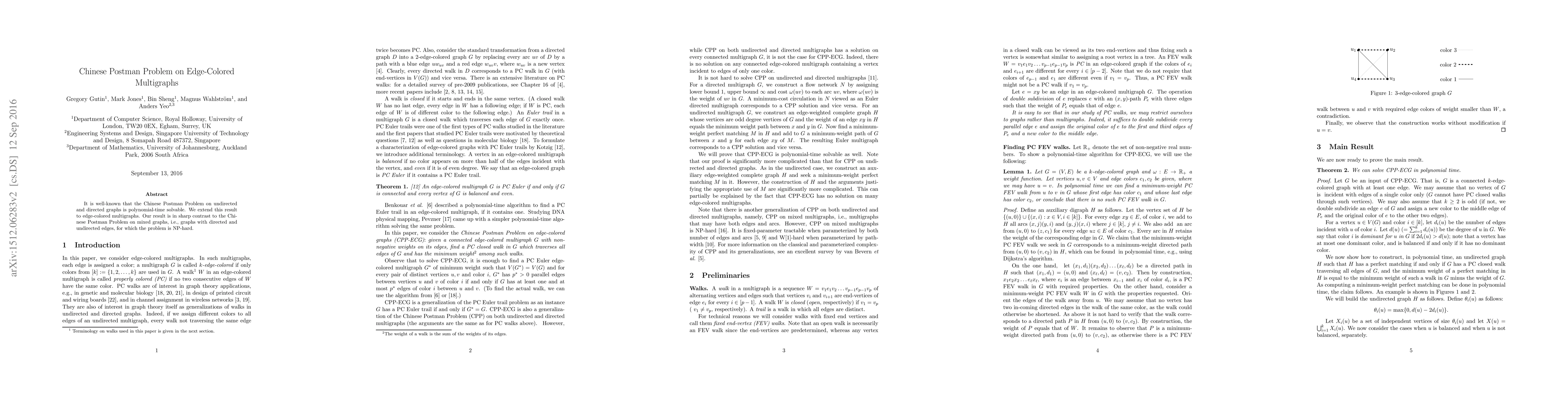 Summary: This paper solves the Chinese postman problem for edge-colored multigraphs in polynomial time, contrasting with the NP-hard complexity for mixed graphs containing both directed and undirected edges.