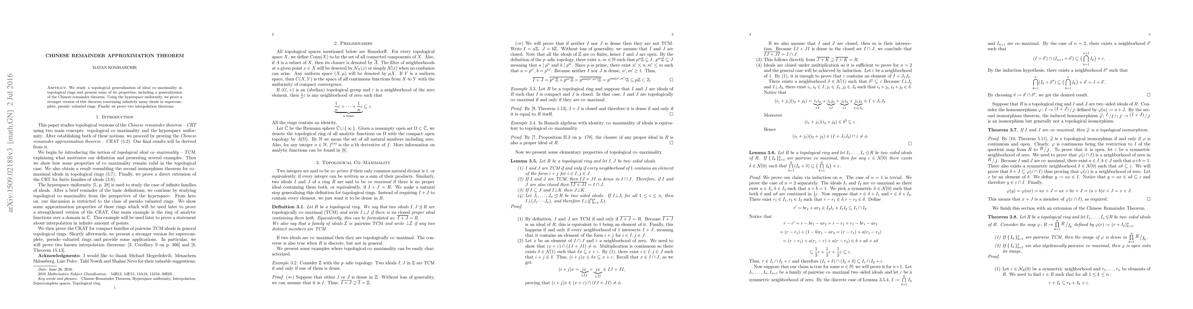 Summary: This paper generalizes the Chinese Remainder Theorem in topological rings, proving a stronger version for infinitely many ideals in supercomplete, pseudo-valuated rings, and also establishes two interpolation theorems using hyperspace uniformity.