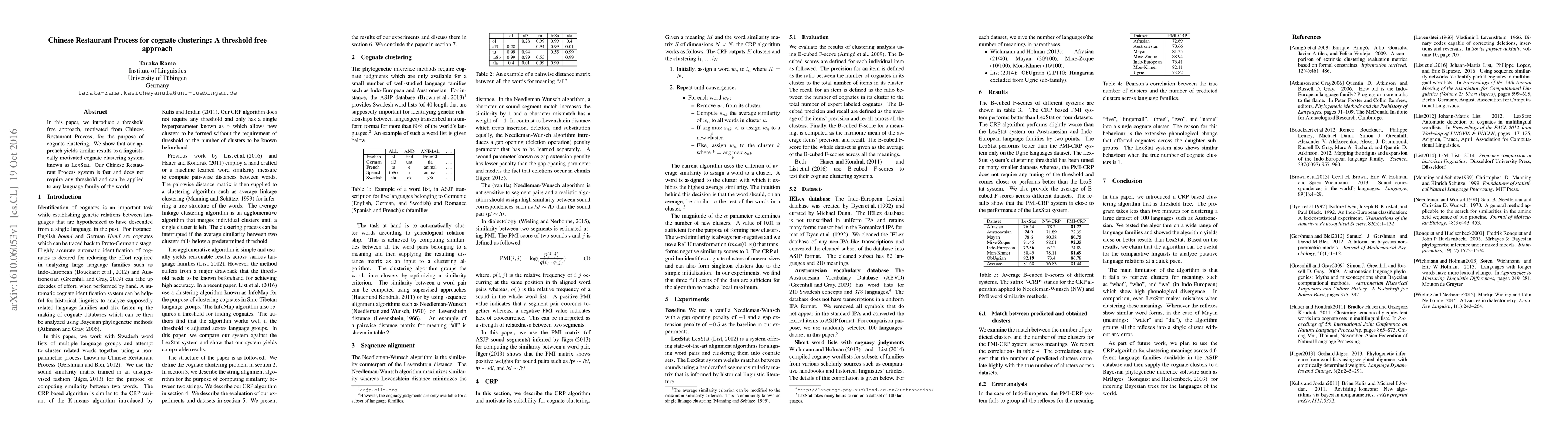 This paper proposes a threshold-free cognate clustering method inspired by the Chinese Restaurant Process, demonstrating comparable results to LexStat without requiring thresholds, and highlighting its applicability to any language family.