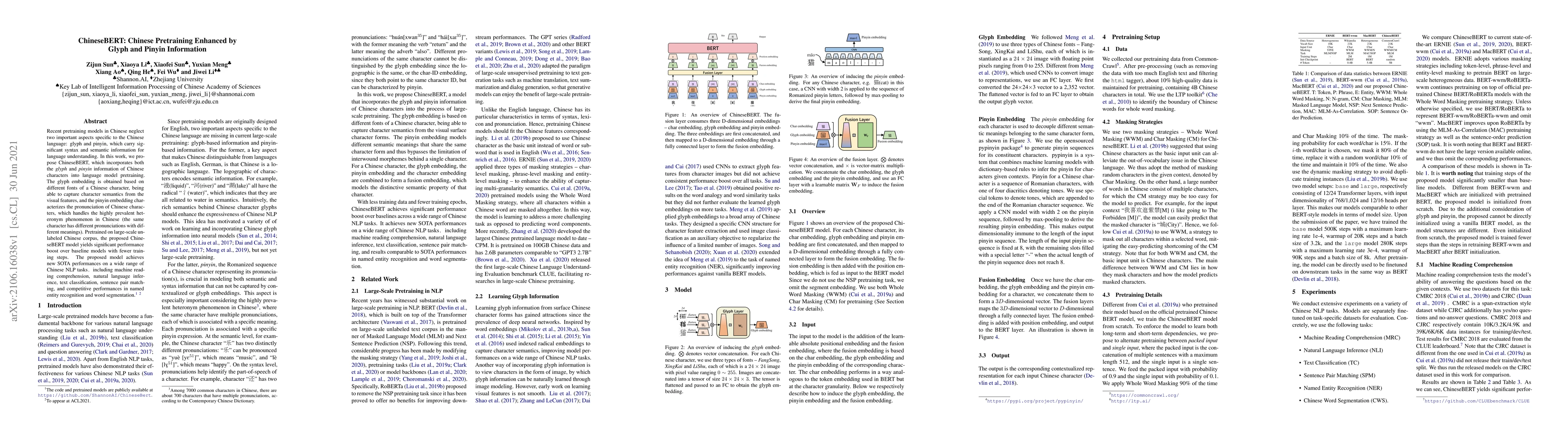 This paper introduces ChineseBERT, a pretraining model that enhances language understanding in Chinese by incorporating glyph and pinyin information. The glyph captures visual semantics, while pinyin addresses pronunciation ambiguities, leading to improved performance on various NLP tasks.