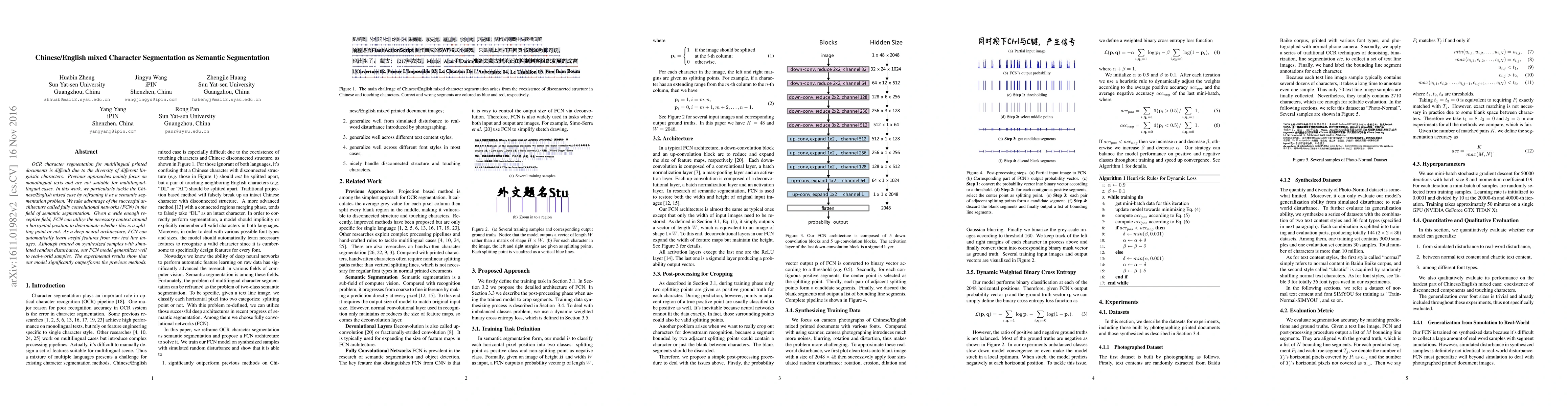 This paper proposes a fully convolutional network (FCN) for Chinese/English mixed character segmentation, framing it as a semantic segmentation problem. The FCN model, trained on synthesized data, generalizes well to real-world samples and outperforms previous methods in segmentation accuracy.