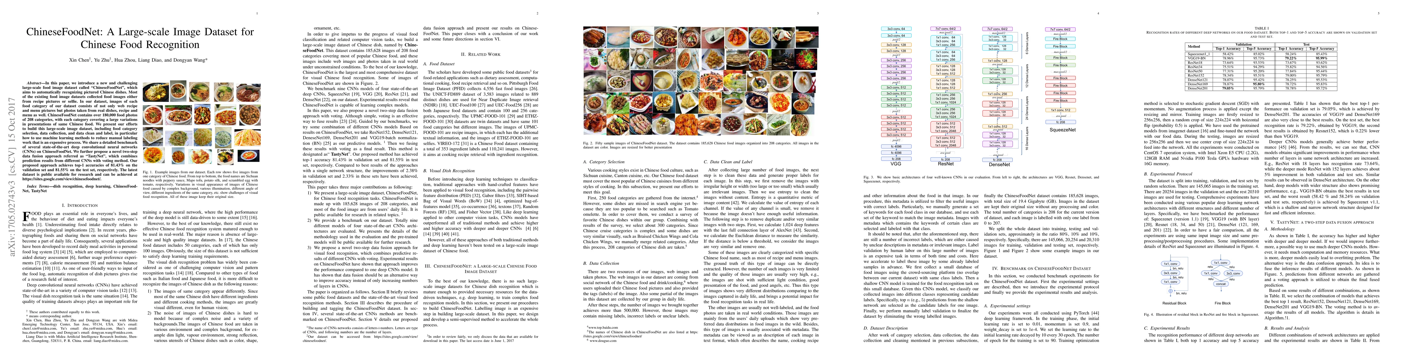 ChineseFoodNet is a large-scale dataset of over 180,000 food images across 208 categories, featuring real dish photos and diverse presentations. The paper introduces a novel two-step data fusion approach, TastyNet, achieving 81.55% accuracy, and makes the dataset publicly available for research.