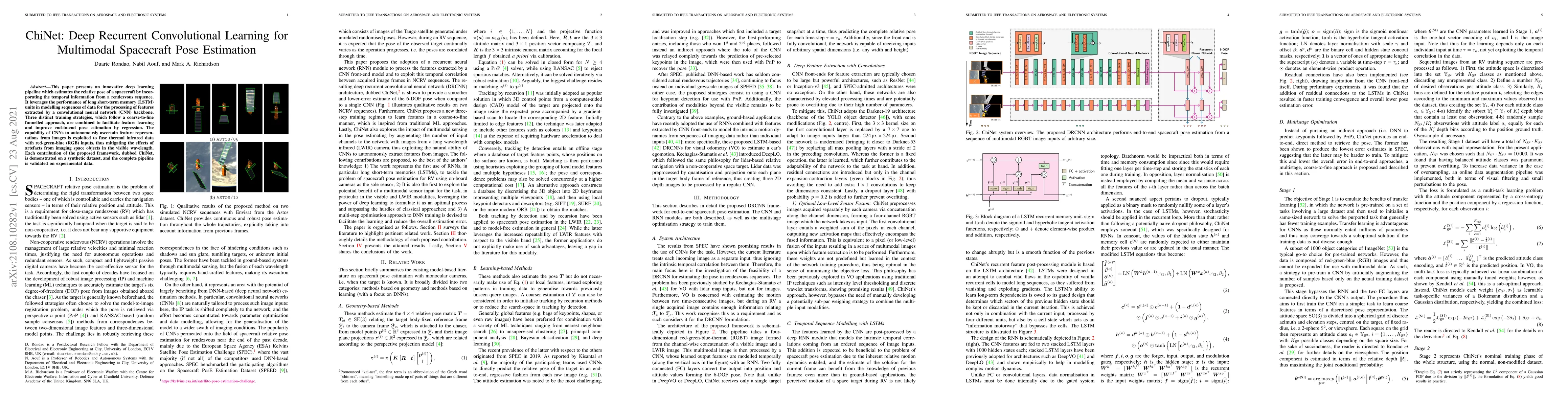 The paper presents ChiNet, a deep learning pipeline for spacecraft pose estimation using a coarse-to-fine, multistage optimization approach. It combines a CNN feature extractor with an LSTM-based RNN for temporal modeling, and incorporates multimodal RGB-T inputs.