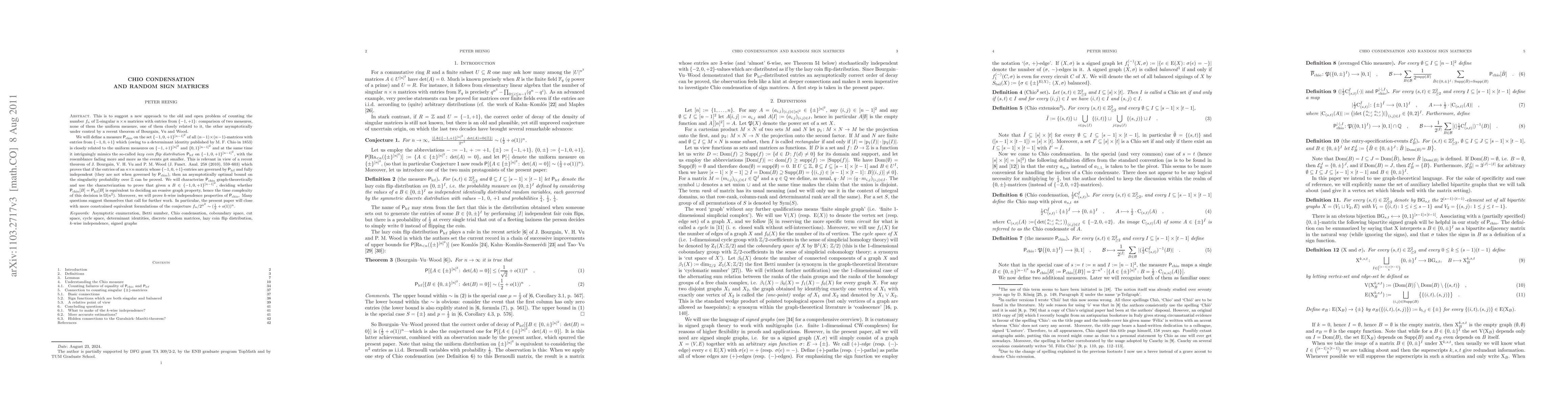 This is to suggest a new approach to the old and open problem of counting the number f_n of Z-singular n x n matrices with entries from {-1,+1}: Comparison of two measures, none of them the uniform measure, one of them closely related to it, the other asymptotically under control by a recent theorem of Bourgain, Vu and Wood. We will define a measure P_chio on the set {-1,0,+1}^([n-1]^2) of all (n-1)x(n-1)-matrices with entries from {-1,0,+1} which (owing to a determinant identity published by M. F. Chio in 1853) is closely related to the uniform measures on {-1,+1}^([n]^2) and {0,1}^([n-1]^2) and at the same time it intriguingly mimics the so-called lazy coin flip distribution P_lcf on {-1,0,+1}^([n-1]^2), with the resemblance fading more and more as the events get smaller. This is relevant in view of a recent theorem of J. Bourgain, V. H. Vu and P. M. Wood (J. Funct. Anal. 258 (2010), 559--603) which proves that if the entries of an n x n matrix whose {-1,0,+1}-entries are governed by P_lcf and fully independent (they are not when governed by P_chio), then an asymptotically optimal bound on the singularity probability over Z can be proved. We will characterize P_chio graph-theoretically and use the characterization to prove that given a B in {-1,0,+1}^([n-1]^2), deciding whether P_chio[B] = P_lcf[B] is equivalent to deciding an evasive graph property, hence the time complexity of this decision is Omega(n^2). Moreover, we will prove k-wise independence properties of P_chio. Many questions suggest themselves that call for further work. In particular, the present paper will close with more constrained equivalent formulations of the conjecture f_n/2^(n^2) ~ (1/2 + o(1))^n.