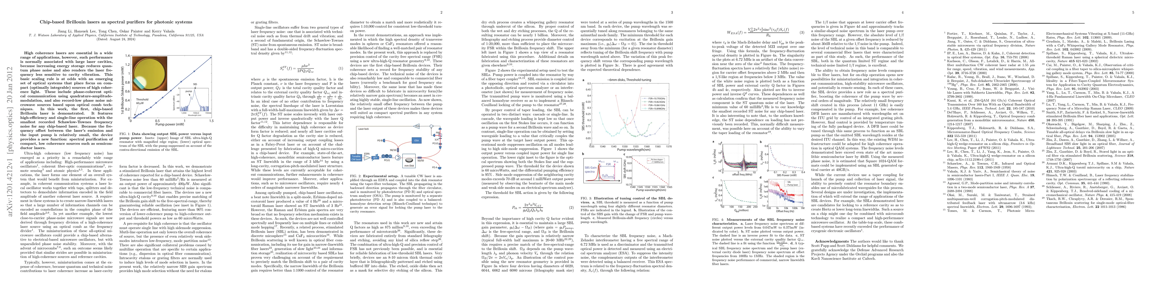 High coherence lasers are essential in a wide range of applications, however, such performance is normally associated with large laser cavities, because increasing energy storage reduces quantum phase noise and also renders the laser frequency less sensitive to cavity vibration. This basic scaling rule is at odds with an emerging set of optical systems that place focus on compact (optimally integrable) sources of high coherence light. These include phase-coherent optical communication using quadrature-amplitude-modulation, and also record-low phase noise microwave sources based upon optical comb techniques. In this work, the first, chip-based Brillouin laser is demonstrated. It features high-efficiency and single-line operation with the smallest recorded Schawlow-Townes frequency noise for any chip-based laser. Because the frequency offset between the laser's emission and the input pump is relatively small, the device provides a new function: spectral purification of compact, low coherence sources such as semiconductor lasers.