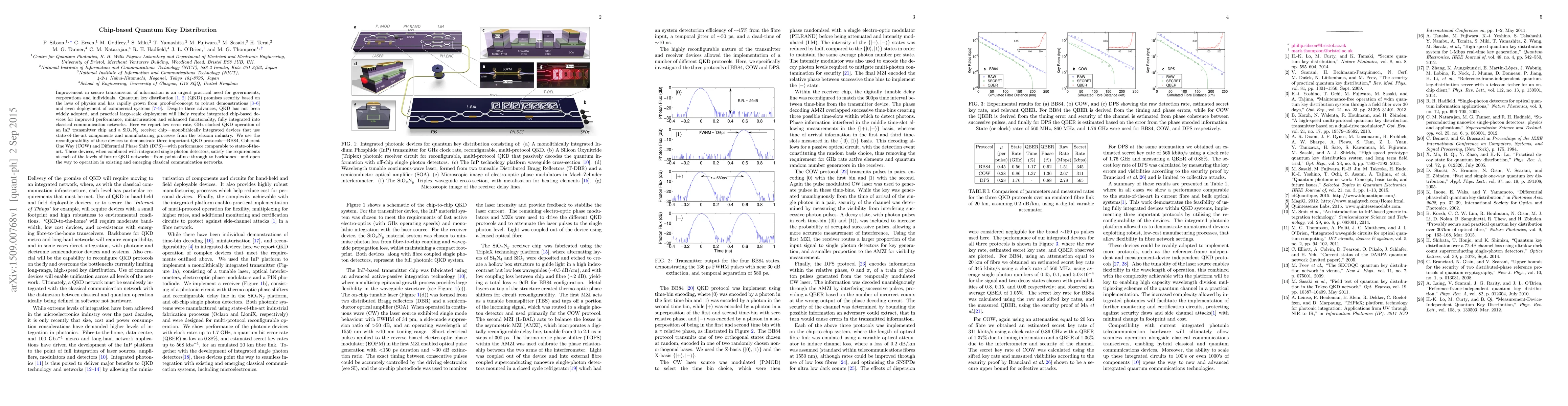 This paper reports on the development of chip-based quantum key distribution (QKD) devices using InP and SiO$_x$N$_y$ materials, demonstrating low error rates and GHz clock speeds. The integration of these devices supports multiple QKD protocols, paving the way for their use in existing and future communication networks.