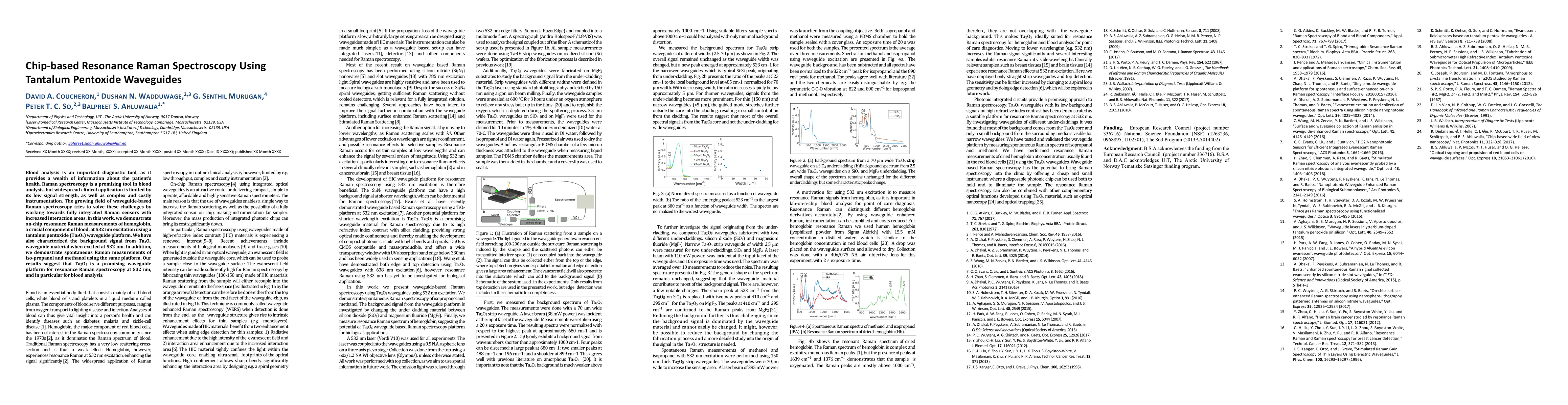 This paper presents a chip-based resonance Raman spectroscopy method using tantalum pentoxide waveguides, demonstrating effective on-chip measurements of hemoglobin and solvents like iso-propanol and methanol, suggesting the platform's potential for enhanced blood analysis.