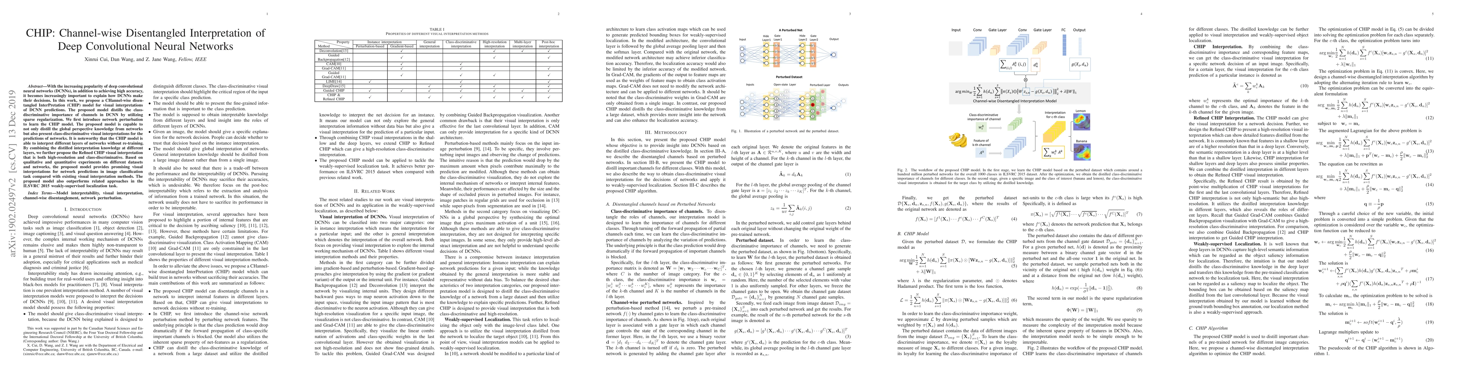 The CHIP model provides a channel-wise disentangled interpretation for deep convolutional neural networks, offering visual insights into their predictions through sparse regularization and network perturbation techniques. It achieves high-resolution, class-discriminative interpretations without requiring re-training, outperforming existing methods in image classification and weakly-supervised localization tasks.