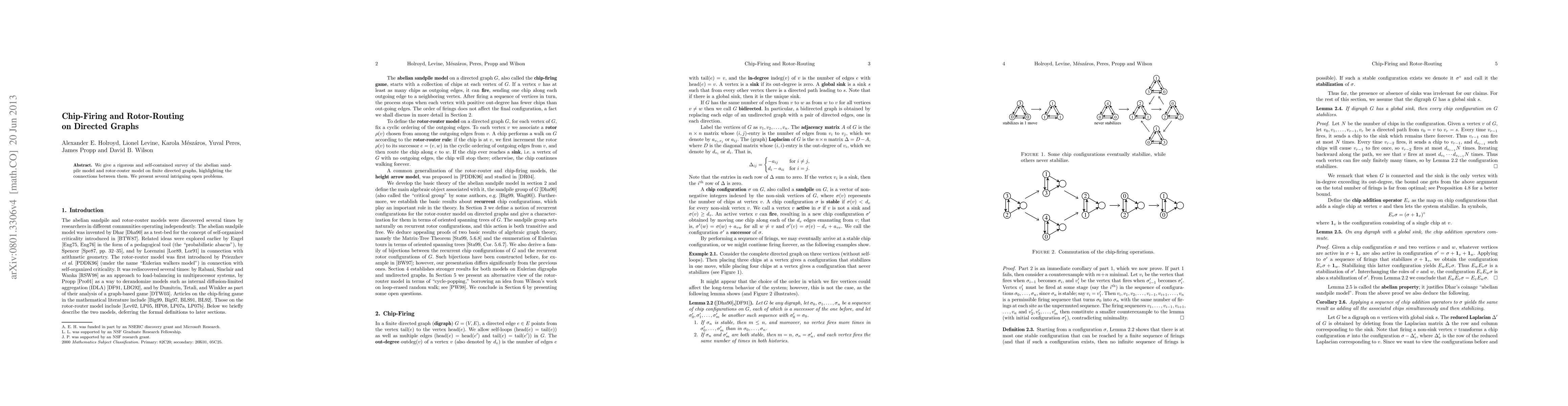 The paper provides a rigorous and self-contained survey of the abelian sandpile model and rotor-router model on finite directed graphs, highlighting their connections and presenting several open problems.