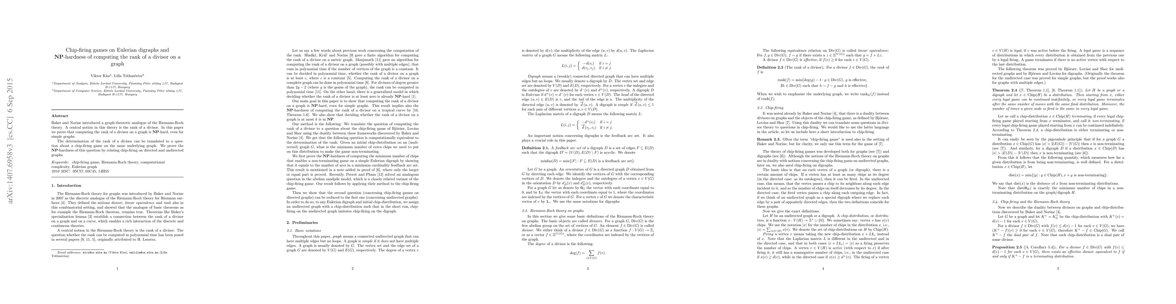 This paper proves that computing the rank of a divisor on a graph, central to Baker and Norine's graph-theoretic analogue of Riemann-Roch theory, is NP-hard. The authors relate this problem to the chip-firing game on Eulerian digraphs and show that determining the rank translates into an NP-hard chip-firing game question.