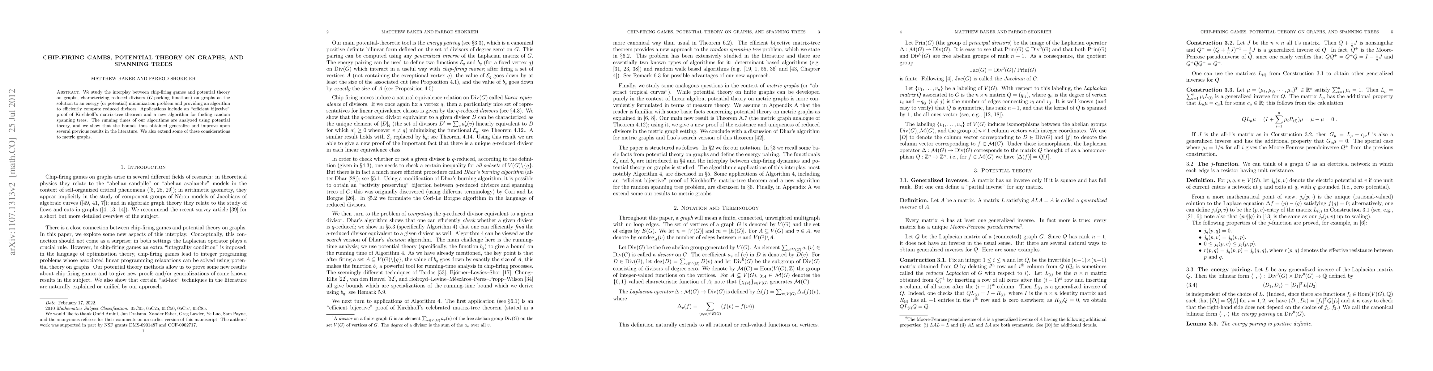 This paper explores the connection between chip-firing games and potential theory on graphs, demonstrating that reduced divisors are solutions to energy minimization problems. It provides efficient algorithms for computing these divisors, proving Kirchhoff's matrix-tree theorem bijectively and developing a new method for generating random spanning trees, with improved running time bounds.