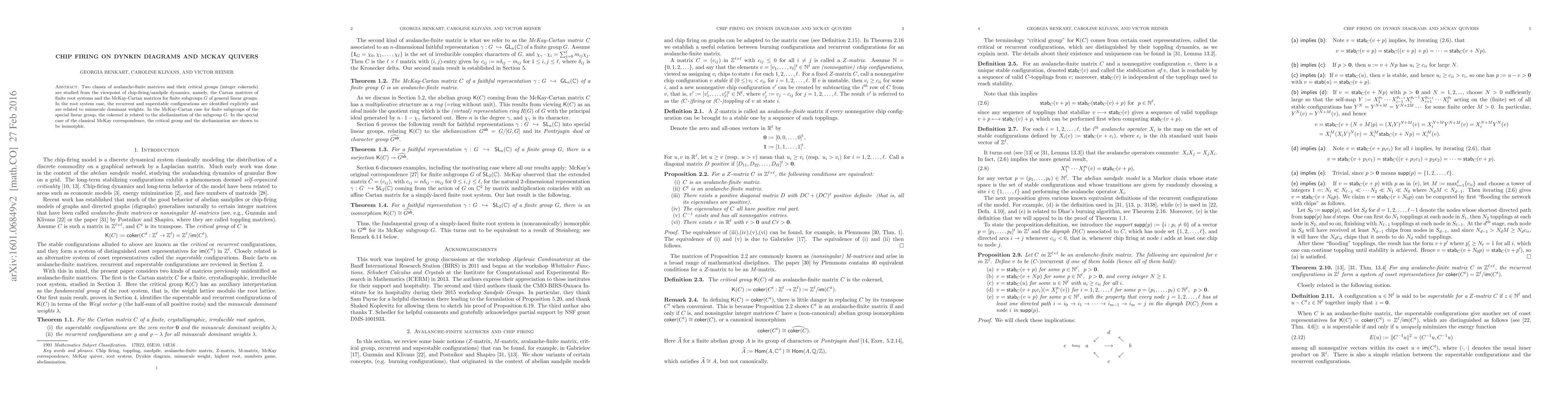 Two classes of avalanche-finite matrices and their critical groups (integer cokernels) are studied from the viewpoint of chip-firing/sandpile dynamics, namely, the Cartan matrices of finite root systems and the McKay-Cartan matrices for finite subgroups G of general linear groups. In the root system case, the recurrent and superstable configurations are identified explicitly and are related to minuscule dominant weights. In the McKay-Cartan case for finite subgroups of the special linear group, the cokernel is related to the abelianization of the subgroup G. In the special case of the classical McKay correspondence, the critical group and the abelianization are shown to be isomorphic.
