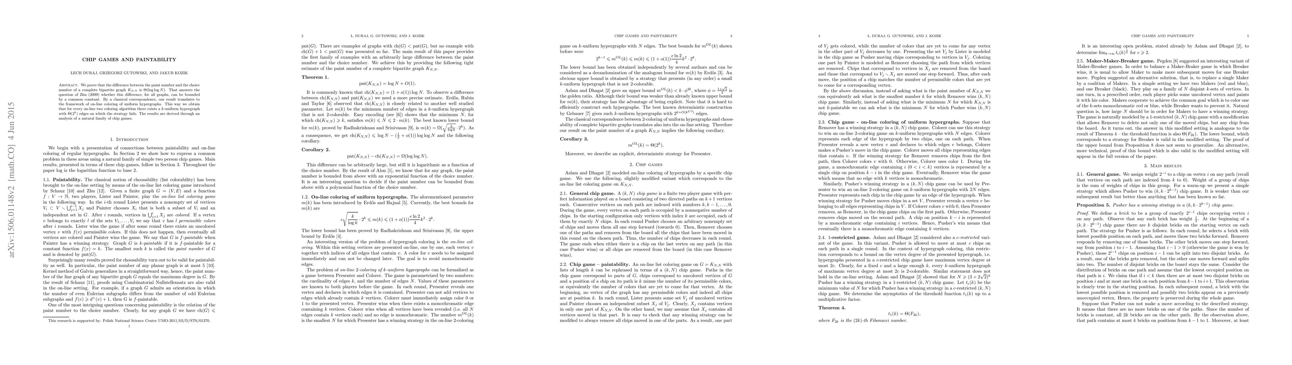 We prove that the difference between the paint number and the choice number of a complete bipartite graph $K_{N,N}$ is $\Theta(\log \log N )$. That answers the question of Zhu (2009) whether this difference, for all graphs, can be bounded by a common constant. By a classical correspondence, our result translates to the framework of on-line coloring of uniform hypergraphs. This way we obtain that for every on-line two coloring algorithm there exists a k-uniform hypergraph with $\Theta(2^k )$ edges on which the strategy fails. The results are derived through an analysis of a natural family of chip games.