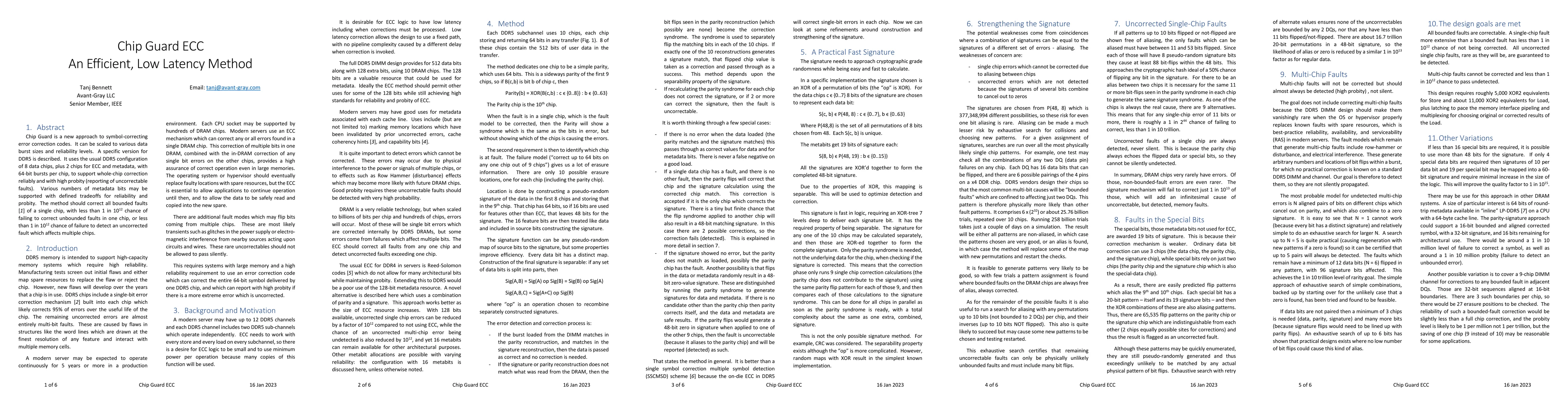 Chip Guard ECC presents an efficient, scalable error correction method for DDR5 memory, correcting single-chip faults with high reliability and detecting multi-chip faults with minimal failure probability. It leverages a configuration of 8 data chips plus 2 ECC chips to ensure whole-chip correction and fault reporting.