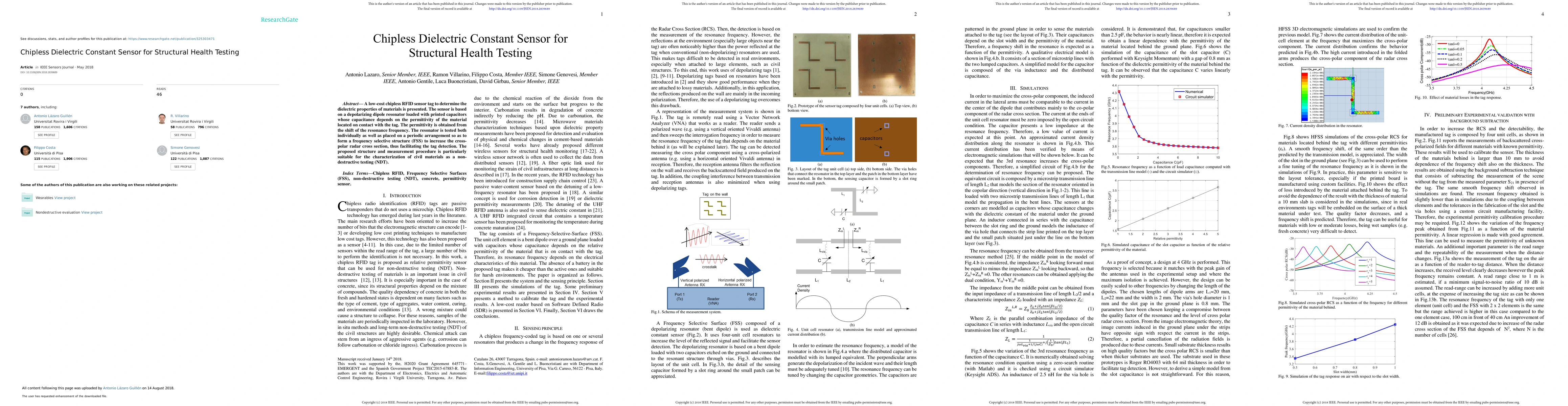 This paper presents a low-cost chipless RFID sensor tag for determining material dielectric properties through resonance frequency shifts. The sensor uses a depolarizing dipole resonator with printed capacitors for permittivity measurement, and a frequency selective structure enhances detection, making it ideal for nondestructive testing of civil materials.