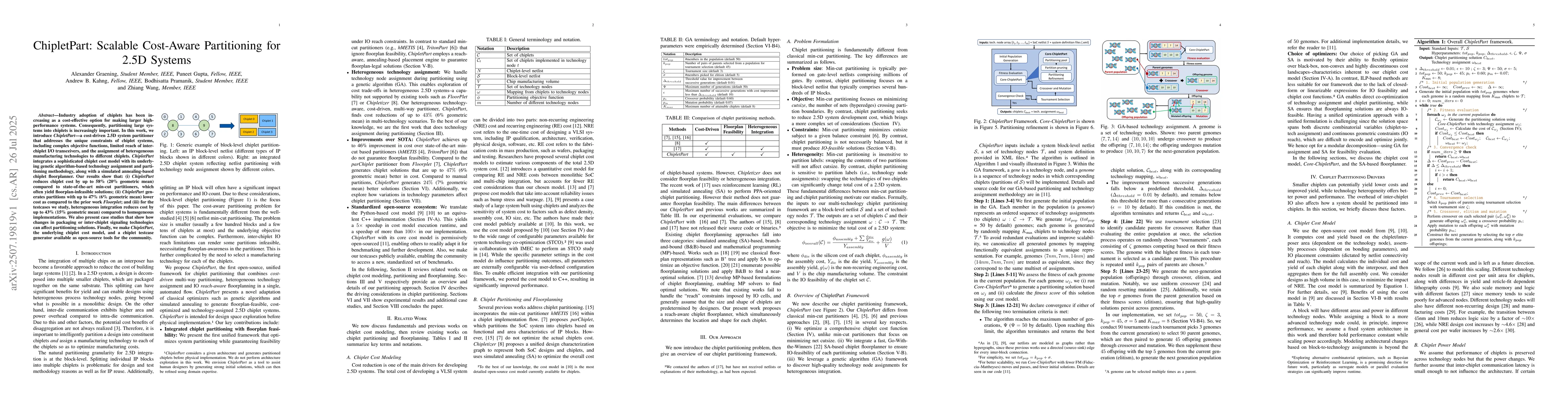 Industry adoption of chiplets has been increasing as a cost-effective option for making larger high-performance systems. Consequently, partitioning large systems into chiplets is increasingly important. In this work, we introduce ChipletPart - a cost-driven 2.5D system partitioner that addresses the unique constraints of chiplet systems, including complex objective functions, limited reach of inter-chiplet I/O transceivers, and the assignment of heterogeneous manufacturing technologies to different chiplets. ChipletPart integrates a sophisticated chiplet cost model with its underlying genetic algorithm-based technology assignment and partitioning methodology, along with a simulated annealing-based chiplet floorplanner. Our results show that: (i) ChipletPart reduces chiplet cost by up to 58% (20% geometric mean) compared to state-of-the-art min-cut partitioners, which often yield floorplan-infeasible solutions; (ii) ChipletPart generates partitions with up to 47% (6% geometric mean) lower cost as compared to the prior work Floorplet; and (iii) for the testcases we study, heterogeneous integration reduces cost by up to 43% (15% geometric mean) compared to homogeneous implementations. We also present case studies that show how changes in packaging or inter-chiplet signaling technologies can affect partitioning solutions. Finally, we make ChipletPart, the underlying chiplet cost model, and a chiplet testcase generator available as open-source tools for the community.