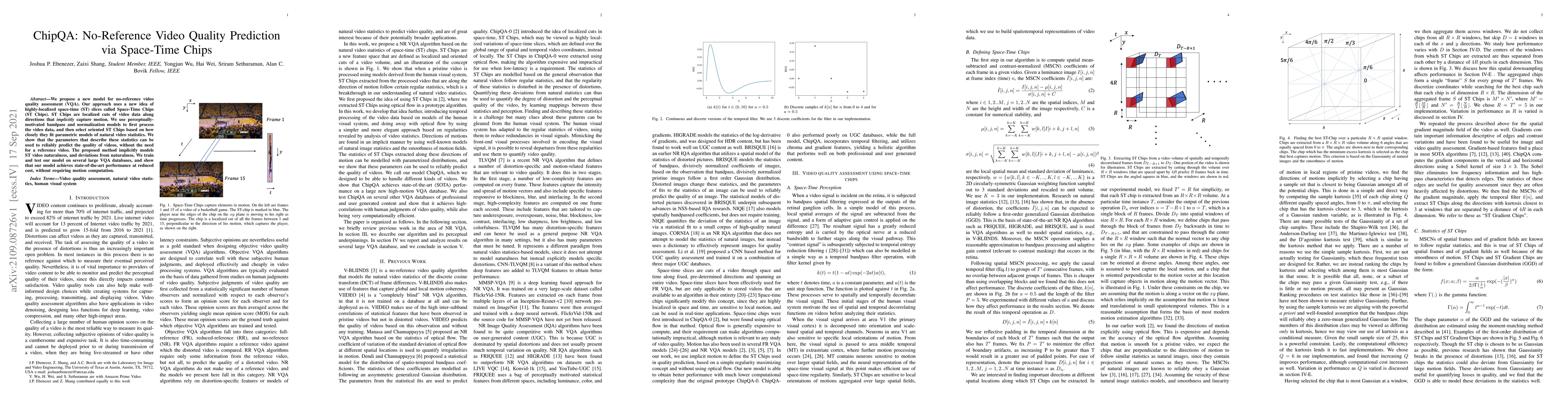 The paper introduces a no-reference video quality assessment model using Space-Time Chips, which are localized space-time slices capturing motion, to predict video quality based on natural video statistics without a reference. The method achieves state-of-the-art performance with reduced computational cost.