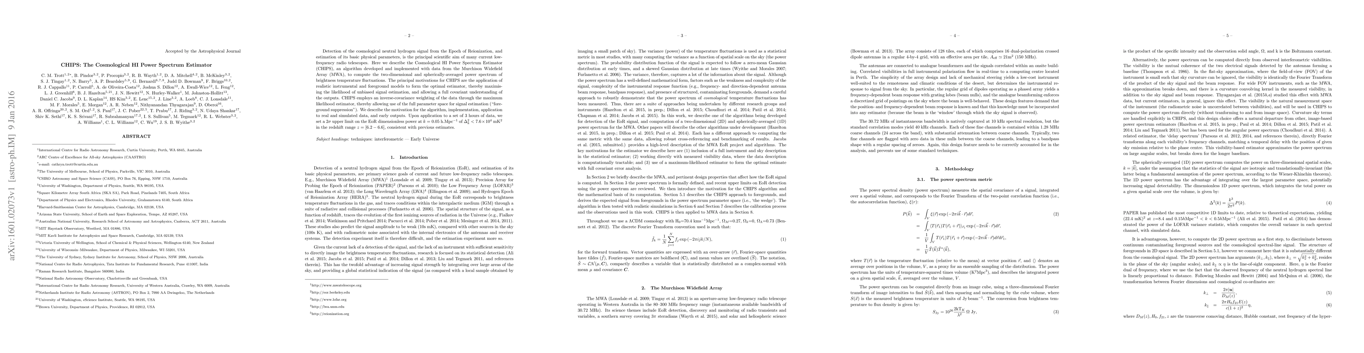 CHIPS is an algorithm developed to estimate the power spectrum of brightness temperature fluctuations from the Epoch of Reionization using data from the MWA. It employs maximum likelihood estimation with inverse-covariance weighting to maximize unbiased signal detection and foreground suppression.
