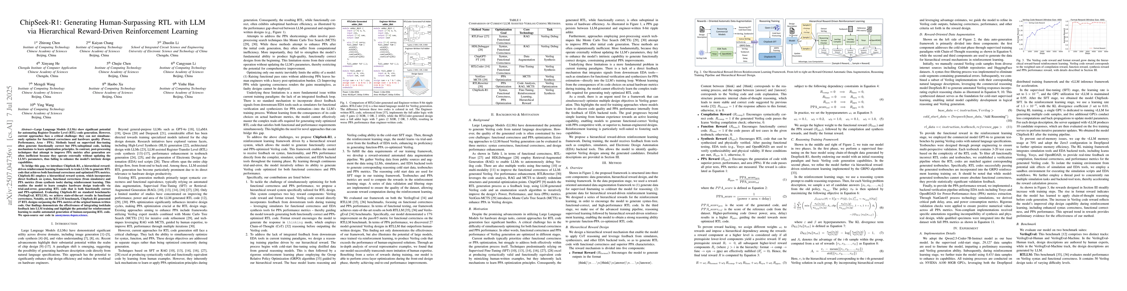 Large Language Models (LLMs) show significant potential for automating Register-Transfer Level (RTL) code generation. However, current approaches face a critical challenge: they can not simultaneously optimize for functional correctness and hardware quality (Power, Performance, Area - PPA). Methods based on supervised fine-tuning often generate functionally correct but PPA-suboptimal code, lacking mechanisms to learn optimization principles. In contrast, post-processing techniques that attempt to improve PPA metrics after generation are often inefficient because they operate externally without updating the LLM's parameters, thus failing to enhance the model's intrinsic design capabilities. To bridge this gap, we introduce ChipSeek-R1, a hierarchical reward-driven reinforcement learning framework to train LLMs to generate RTL code that achieves both functional correctness and optimized PPA metrics. ChipSeek-R1 employs a hierarchical reward system, which incorporates direct feedback on syntax, functional correctness (from simulators) and PPA metrics (from synthesis tools) during reinforcement learning. This enables the model to learn complex hardware design trade-offs via trial-and-error, generating RTL code that is both functionally correct and PPA-optimized. Evaluating ChipSeek-R1 on standard benchmarks (VerilogEval, RTLLM), we achieve state-of-the-art results in functional correctness. Notably, on the RTLLM benchmark, ChipSeek-R1 generated 27 RTL designs surpassing the PPA metrics of the original human-written code. Our findings demonstrate the effectiveness of integrating toolchain feedback into LLM training and highlight the potential for reinforcement learning to enable automated generation of human-surpassing RTL code. We open-source our code in anonymous github.