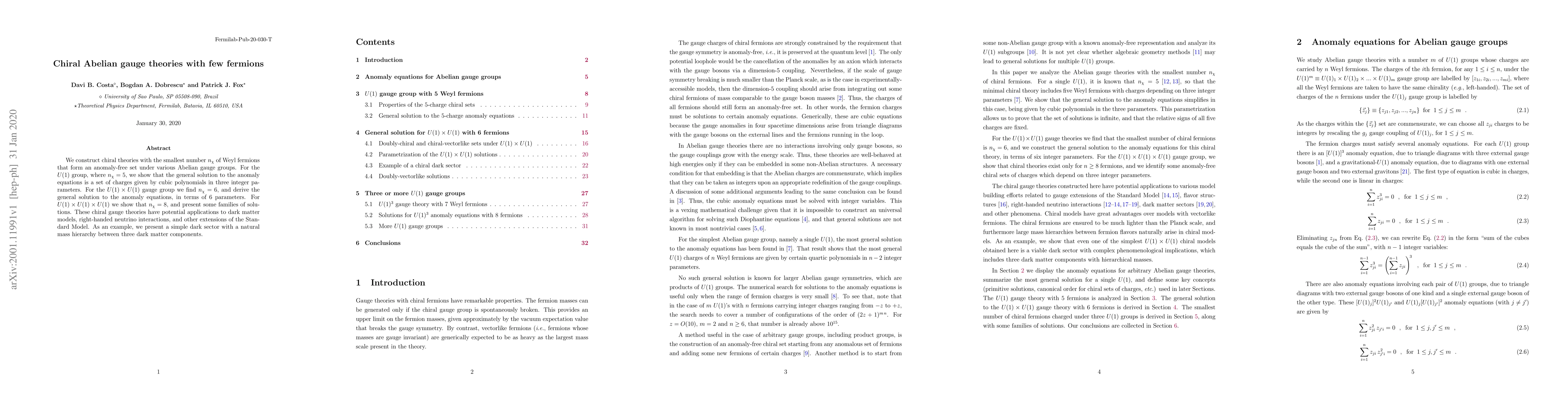 We construct chiral theories with the smallest number $n_\chi$ of Weyl fermions that form an anomaly-free set under various Abelian gauge groups. For the $U(1)$ group, where $n_\chi = 5$, we show that the general solution to the anomaly equations is a set of charges given by cubic polynomials in three integer parameters. For the $U(1) \times U(1)$ gauge group we find $n_\chi = 6$, and derive the general solution to the anomaly equations, in terms of 6 parameters. For $U(1) \times U(1) \times U(1)$ we show that $n_\chi = 8$, and present some families of solutions. These chiral gauge theories have potential applications to dark matter models, right-handed neutrino interactions, and other extensions of the Standard Model. As an example, we present a simple dark sector with a natural mass hierarchy between three dark matter components.