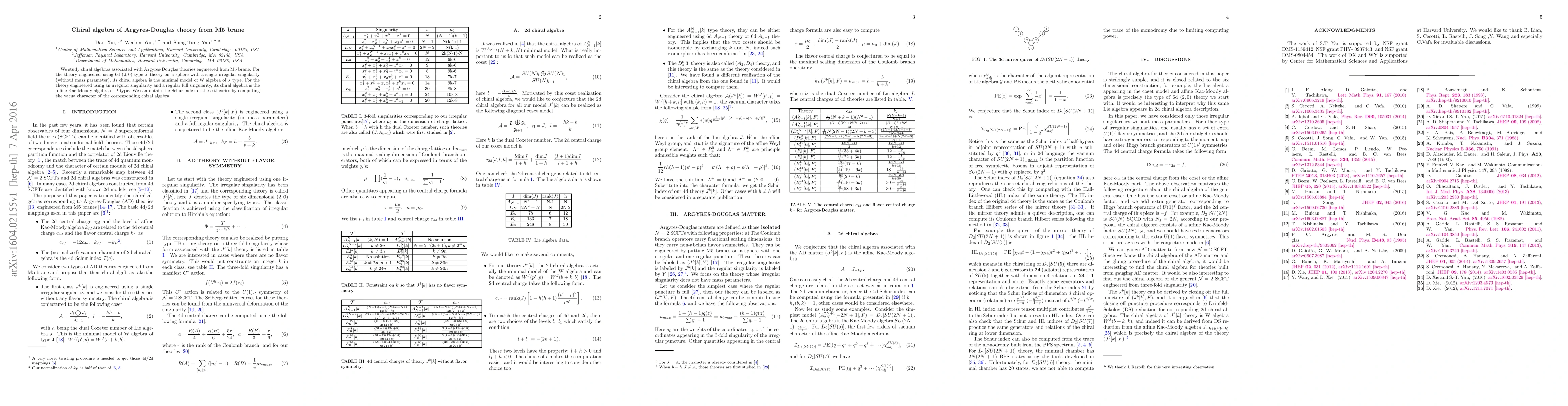 This paper investigates the chiral algebras linked to Argyres-Douglas theories created from M5 branes. It reveals that the chiral algebra for a type $J$ theory on a sphere with a single irregular singularity corresponds to the minimal model of the $J$ type W algebra, while a combination of irregular and regular singularities leads to the affine Kac-Moody algebra of $J$ type.