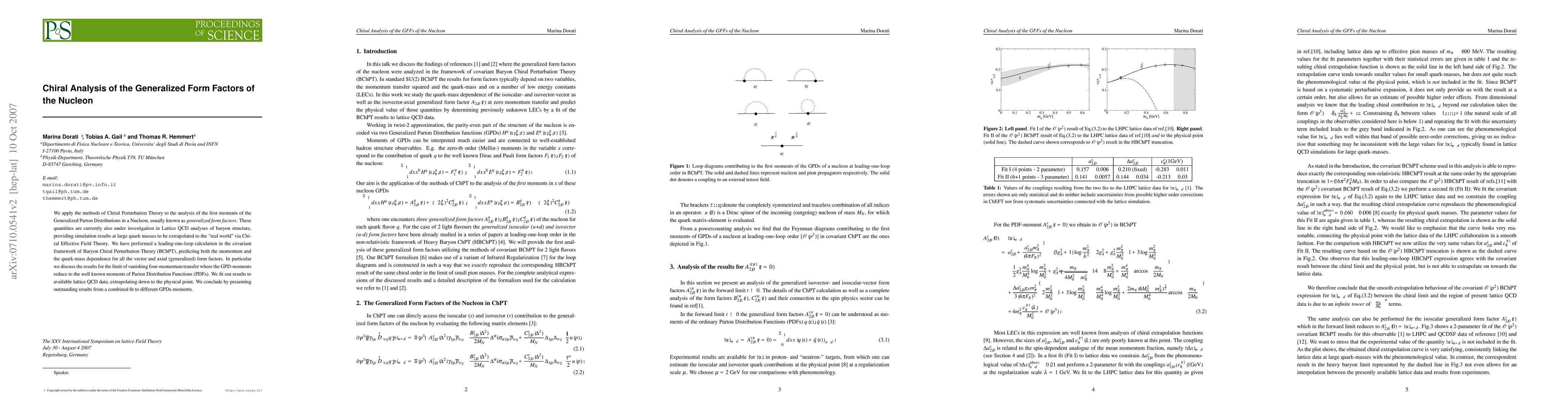We apply the methods of Chiral Perturbation Theory to the analysis of the first moments of the Generalized Parton Distributions in a Nucleon, usually known as generalized form factors. These quantities are currently also under investigation in Lattice QCD analyses of baryon structure, providing simulation results at large quark masses to be extrapolated to the "real world" via Chiral Effective Field Theory. We have performed a leading-one-loop calculation in the covariant framework of Baryon Chiral Perturbation Theory (BChPT), predicting both the momentum and the quark-mass dependence for all the vector and axial (generalized) form factors. In particular we discuss the results for the limit of vanishing four-momentum transfer where the GPD-moments reduce to the well known moments of Parton Distribution Functions (PDFs). We fit our results to available lattice QCD data, extrapolating down to the physical point. We conclude by presenting outstanding results from a combined fit to different GPDs-moments.