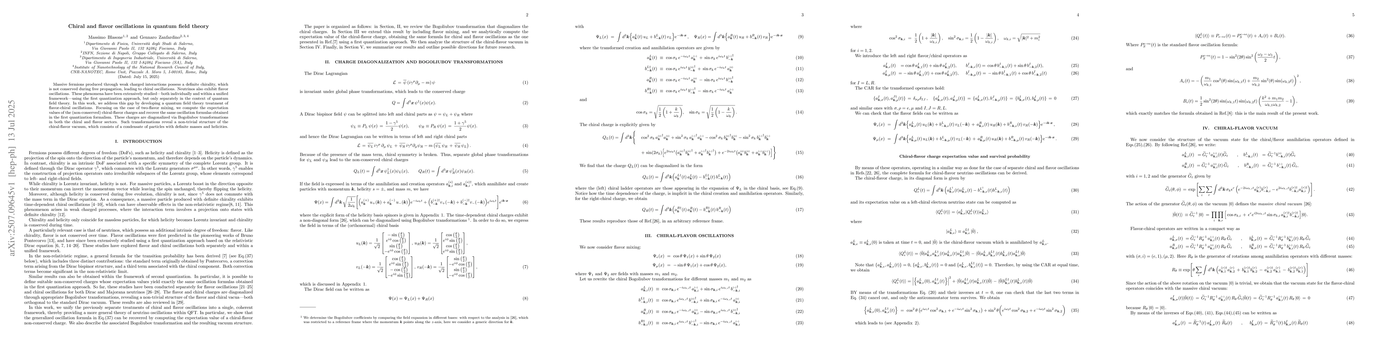 Massive fermions produced through weak charged interactions possess a definite chirality, which is not conserved during free propagation, leading to chiral oscillations. Neutrinos also exhibit flavor oscillations. These phenomena have been extensively studied - both individually and within a unified framework - using the first quantization approach, but only separately in the context of quantum field theory. In this work, we address this gap by developing a quantum field theory treatment of flavor-chiral oscillations. Focusing on the case of two-flavor mixing, we compute the expectation values of the (non-conserved) chiral-flavor charges and recover the same oscillation formulas obtained in the first quantization formalism. These charges are diagonalized via Bogoliubov transformations in both the chiral and flavor sectors. Such transformations reveal a non-trivial structure of the chiral-flavor vacuum, which consists of a condensate of particles with definite masses and helicities.