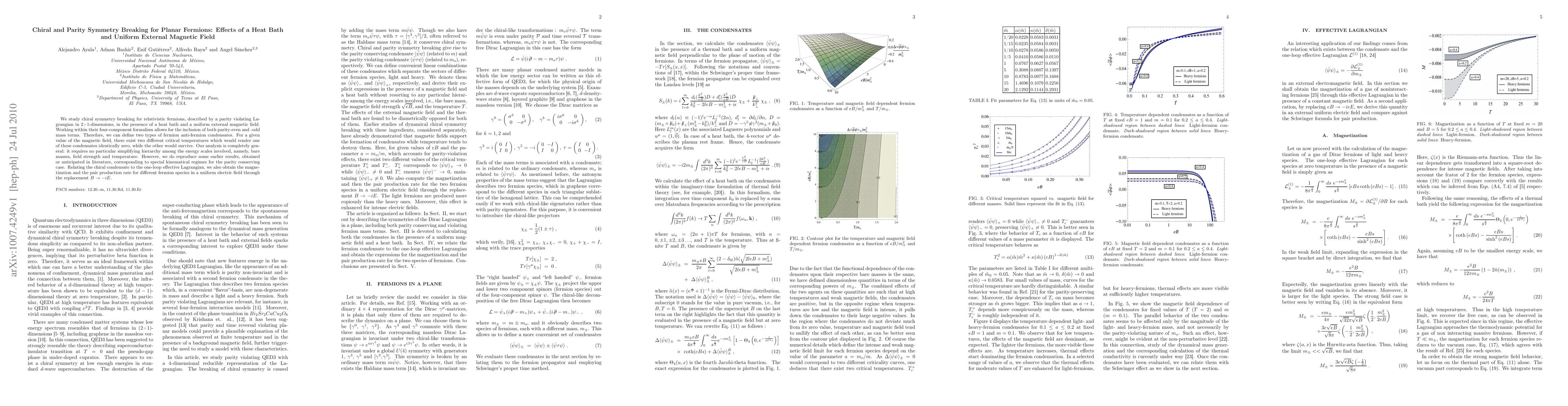 We study chiral symmetry breaking for relativistic fermions, described by a parity violating Lagrangian in 2+1-dimensions, in the presence of a heat bath and a uniform external magnetic field. Working within their four-component formalism allows for the inclusion of both parity-even and -odd mass terms. Therefore, we can define two types of fermion anti-fermion condensates. For a given value of the magnetic field, there exist two different critical temperatures which would render one of these condensates identically zero, while the other would survive. Our analysis is completely general: it requires no particular simplifying hierarchy among the energy scales involved, namely, bare masses, field strength and temperature. However, we do reproduce some earlier results, obtained or anticipated in literature, corresponding to special kinematical regimes for the parity conserving case. Relating the chiral condensate to the one-loop effective Lagrangian, we also obtain the magnetization and the pair production rate for different fermion species in a uniform electric field through the replacement $B\to-iE$.