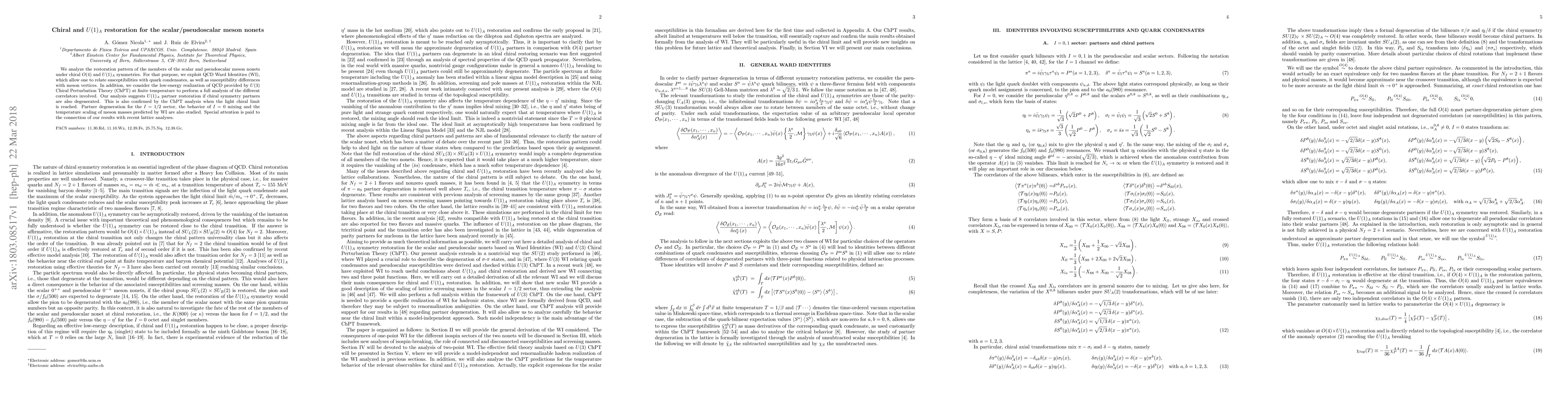 This paper investigates the restoration of chiral and $U(1)_A$ symmetries for scalar and pseudoscalar meson nonets using QCD Ward Identities and $U(3)$ Chiral Perturbation Theory. It finds that $U(1)_A$ symmetry is restored when chiral symmetry partners degenerate, corroborated by ChPT in the light chiral limit.