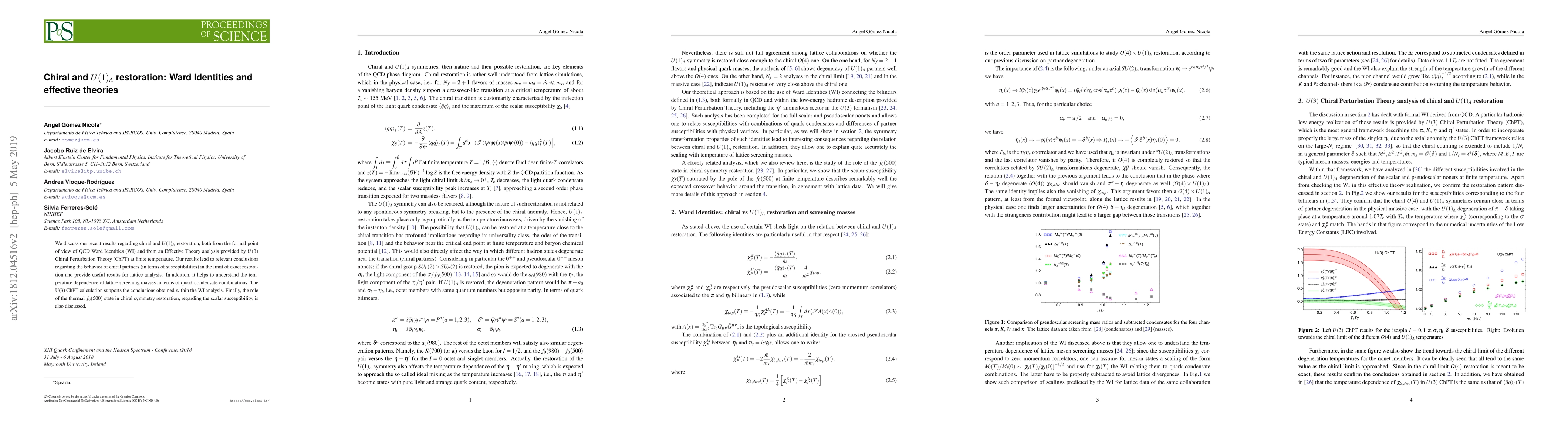 This paper explores chiral and $U(1)_A$ restoration through QCD Ward Identities and $U(3)$ Chiral Perturbation Theory, revealing insights into the behavior of chiral partners and the temperature dependence of lattice screening masses. The study also highlights the role of the thermal $f_0(500)$ state in chiral symmetry restoration.