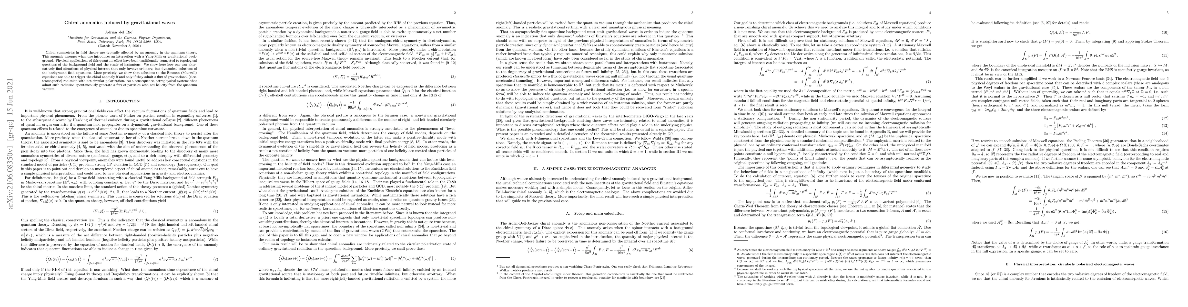 Chiral symmetries in field theory are typically affected by an anomaly in the quantum theory. This anomaly emerges when one introduces an interaction with a Yang-Mills or gravitational background. Physical applications of this quantum effect have been traditionally connected to topological questions of the background field and the study of instantons. We show here how one can alternatively find situations of physical interest that only involve ordinary, but dynamical solutions of the background field equations. More precisely, we show that solutions to the Einstein (Maxwell) equations are able to trigger the chiral anomaly if and only if they admit a flux of gravitational (electromagnetic) radiation with net circular polarization. As a consequence, astrophysical systems that admit such radiation spontaneously generate a flux of particles with net helicity from the quantum vacuum.