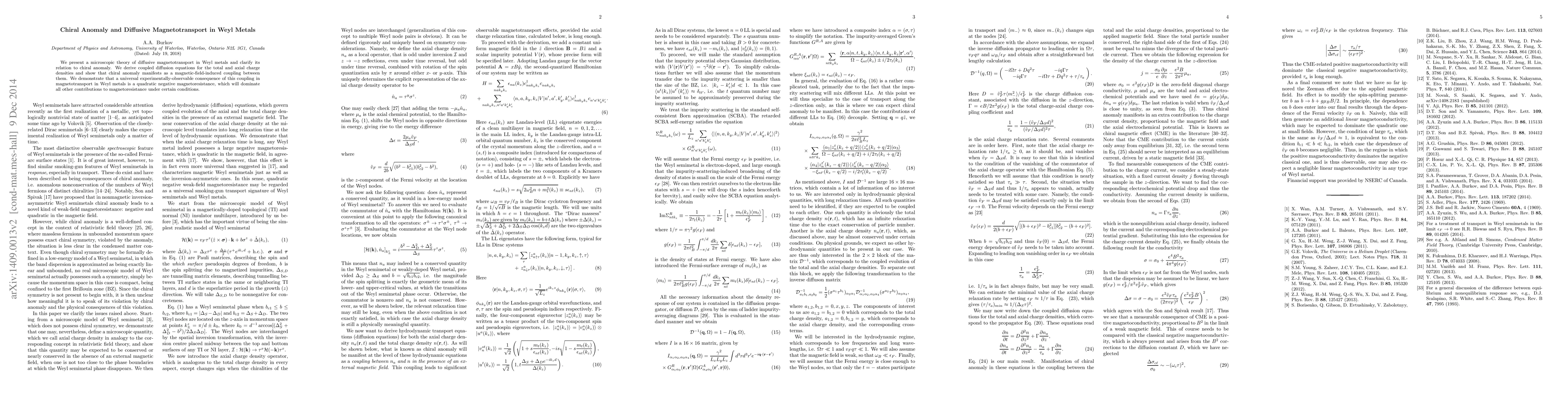 This paper develops a microscopic theory for diffusive magnetotransport in Weyl metals, linking it to the chiral anomaly. It reveals a magnetic-field-induced coupling between total and axial charge densities, leading to a universal quadratic negative magnetoresistance dominating under specific conditions.