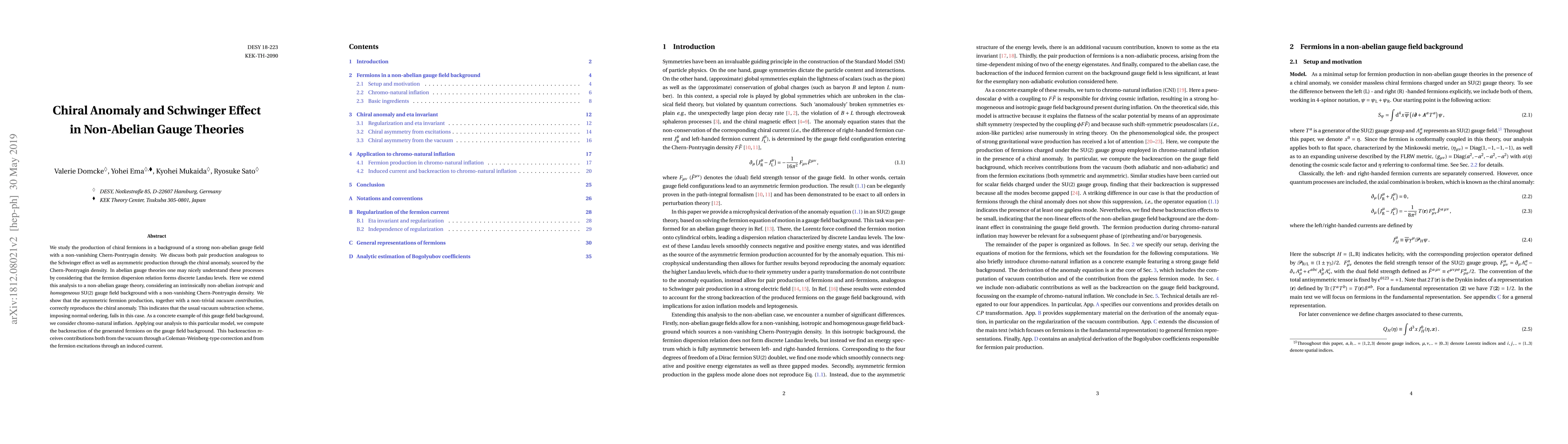 We study the production of chiral fermions in a background of a strong non-abelian gauge field with a non-vanishing Chern-Pontryagin density. We discuss both pair production analogous to the Schwinger effect as well as asymmetric production through the chiral anomaly, sourced by the Chern-Pontryagin density. In abelian gauge theories one may nicely understand these processes by considering that the fermion dispersion relation forms discrete Landau levels. Here we extend this analysis to a non-abelian gauge theory, considering an intrinsically non-abelian isotropic and homogeneous SU(2) gauge field background with a non-vanishing Chern-Pontryagin density. We show that the asymmetric fermion production, together with a non-trivial vacuum contribution, correctly reproduces the chiral anomaly. This indicates that the usual vacuum subtraction scheme, imposing normal ordering, fails in this case. As a concrete example of this gauge field background, we consider chromo-natural inflation. Applying our analysis to this particular model, we compute the backreaction of the generated fermions on the gauge field background. This backreaction receives contributions both from the vacuum through a Coleman-Weinberg-type correction and from the fermion excitations through an induced current.
