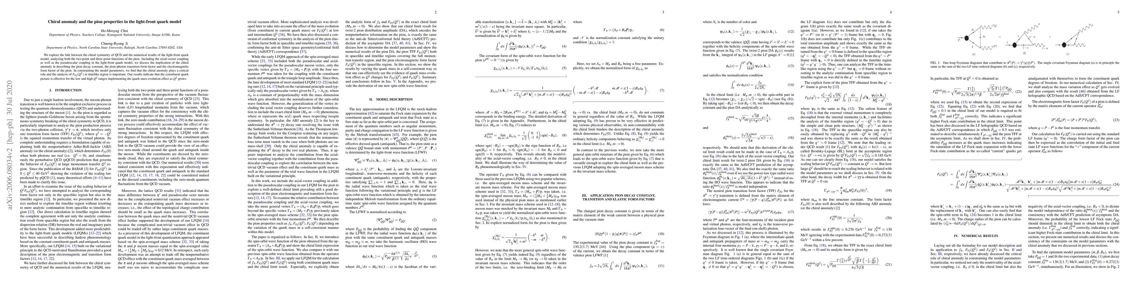 The study links the chiral symmetry of QCD with the light-front quark model, examining pion properties through two-point and three-point functions, and highlights the critical role of the chiral anomaly in describing pion decay constant and electromagnetic form factors, indicating the effectiveness of the constituent quark picture across different momentum ranges.