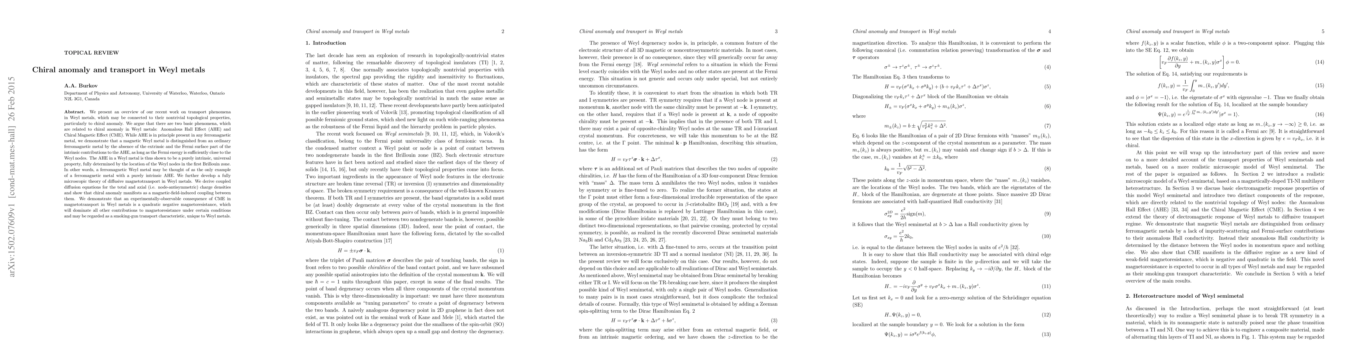 The paper explores transport phenomena in Weyl metals linked to their chiral anomaly, highlighting the Anomalous Hall Effect (AHE) and Chiral Magnetic Effect (CME). It argues that the AHE in magnetic Weyl metals is purely intrinsic, determined by Weyl nodes, distinguishing them from ordinary ferromagnetic metals. The CME leads to a quadratic negative magnetoresistance, a unique transport signature of Weyl metals.