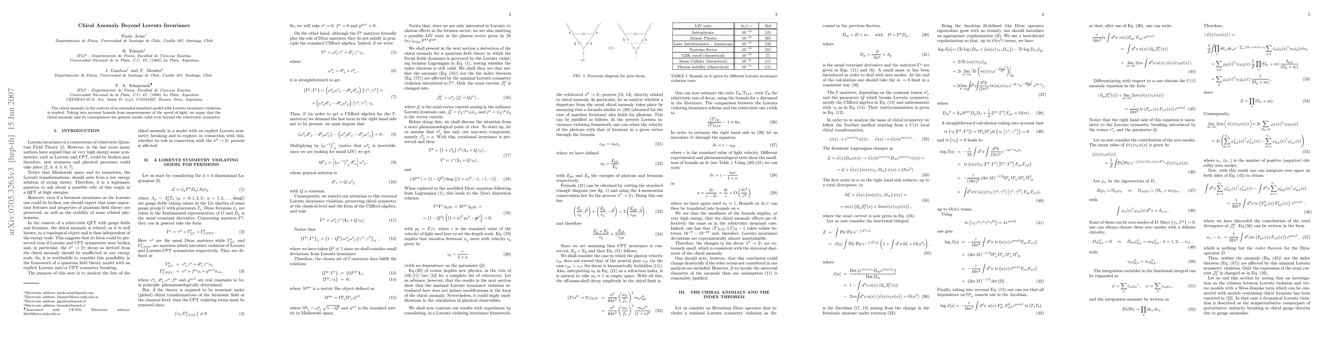Summary: This paper investigates the chiral anomaly in an extended standard model with minimal Lorentz invariance violations, demonstrating that its implications remain valid even when relativistic symmetry is not strictly upheld, supported by constraints from the speed of light measurements.