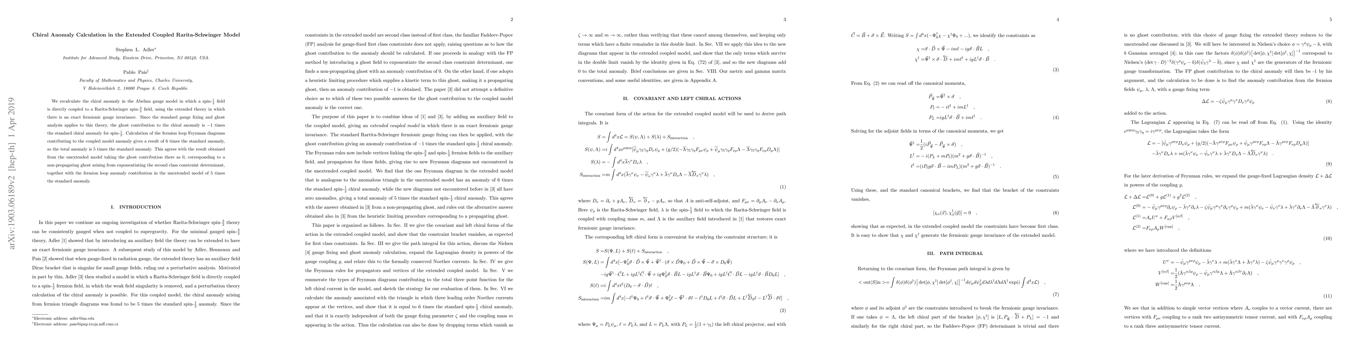 We recalculate the chiral anomaly in the Abelian gauge model in which a spin-$\frac{1}{2}$ field is directly coupled to a Rarita-Schwinger spin-$\frac{3}{2}$ field, using the extended theory in which there is an exact fermionic gauge invariance. Since the standard gauge fixing and ghost analysis applies to this theory, the ghost contribution to the chiral anomaly is $-1$ times the standard chiral anomaly for spin-$\frac{1}{2}$. Calculation of the fermion loop Feynman diagrams contributing to the coupled model anomaly gives a result of $6$ times the standard anomaly, so the total anomaly is $5$ times the standard anomaly. This agrees with the result obtained from the unextended model taking the ghost contribution there as $0$, corresponding to a non-propagating ghost arising from exponentiating the second class constraint determinant, together with the fermion loop anomaly contribution in the unextended model of $5$ times the standard anomaly.