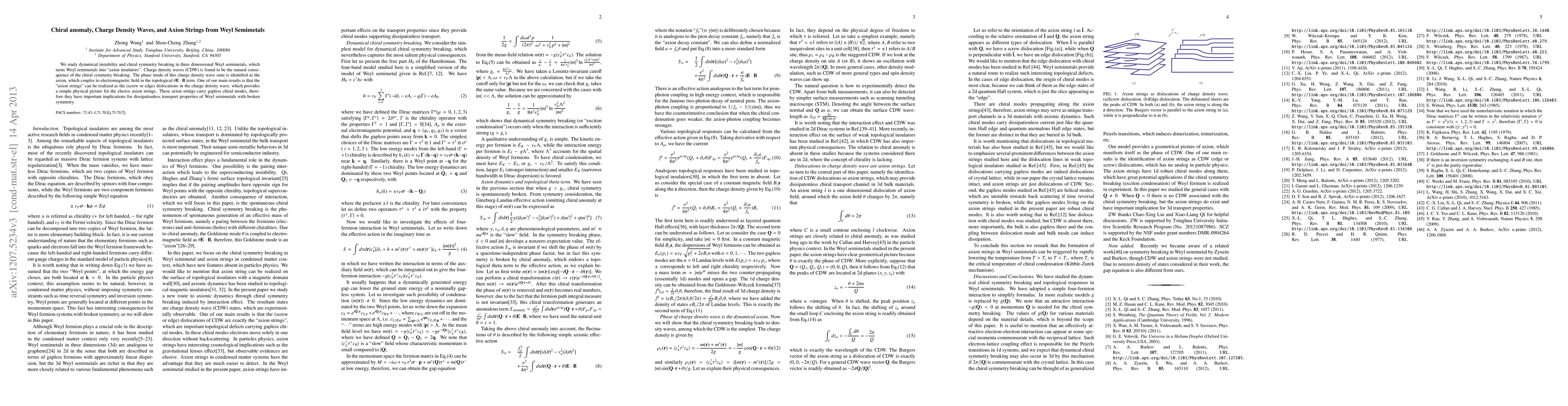 This paper investigates the dynamical instability and chiral symmetry breaking in three-dimensional Weyl semimetals, revealing that charge density waves arise naturally from this breaking. It identifies the phase mode of these waves as an axion, which is coupled to the electromagnetic field through a topological term, and describes "axion strings" as dislocations within the charge density wave, offering insight into their dissipationless transport properties.