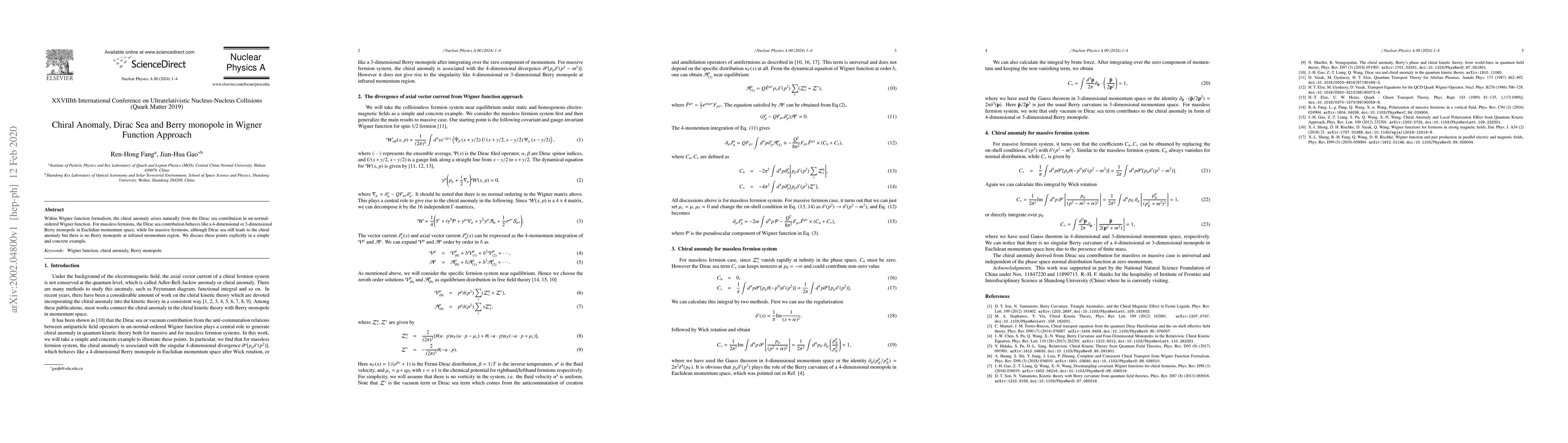 This paper explores the chiral anomaly through the Wigner function approach, revealing that the Dirac sea contribution manifests as a 4D or 3D Berry monopole for massless fermions in Euclidean momentum space, while massive fermions still exhibit chiral anomaly without such a monopole in the infrared region.