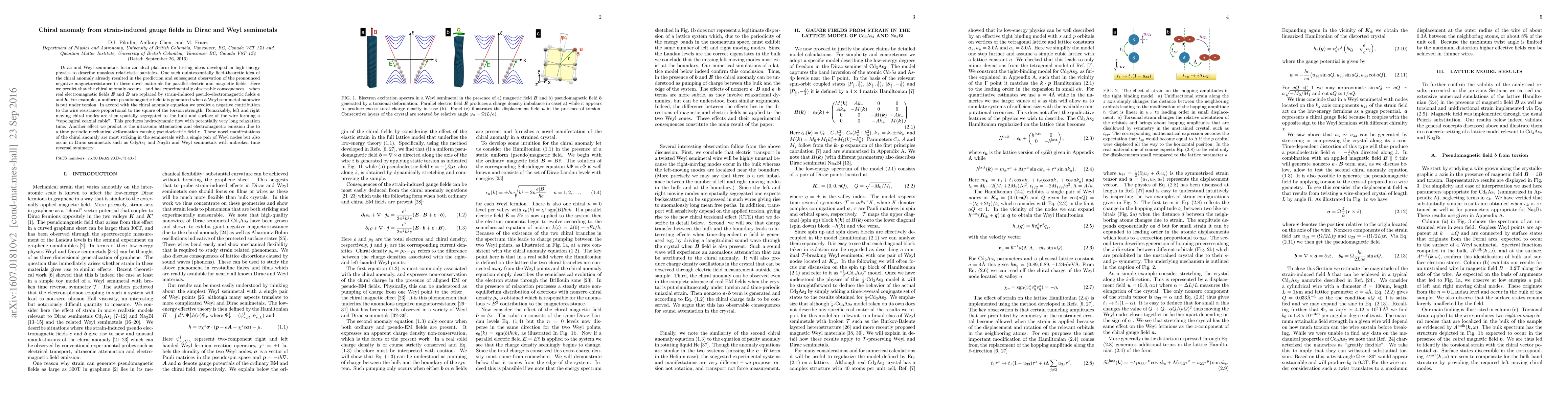 Dirac and Weyl semimetals form an ideal platform for testing ideas developed in high energy physics to describe massless relativistic particles. One such quintessentially field-theoretic idea of chiral anomaly already resulted in the prediction and subsequent observation of the pronounced negative magnetoresistance in these novel materials for parallel electric and magnetic fields. Here we predict that the chiral anomaly occurs - and has experimentally observable consequences - when real electromagnetic fields E and B are replaced by strain-induced pseudo-electromagnetic fields e and b. For example, a uniform pseudomagnetic field b is generated when a Weyl semimetal nanowire is put under torsion. In accord with the chiral anomaly equation we predict a negative contribution to the wire resistance proportional to the square of the torsion strength. Remarkably, left and right moving chiral modes are then spatially segregated to the bulk and surface of the wire forming a "topological coaxial cable". This produces hydrodynamic flow with potentially very long relaxation time. Another effect we predict is the ultrasonic attenuation and electromagnetic emission due to a time periodic mechanical deformation causing pseudoelectric field e. These novel manifestations of the chiral anomaly are most striking in the semimetals with a single pair of Weyl nodes but also occur in Dirac semimetals such as Cd3As2 and Na3Bi and Weyl semimetals with unbroken time reversal symmetry.