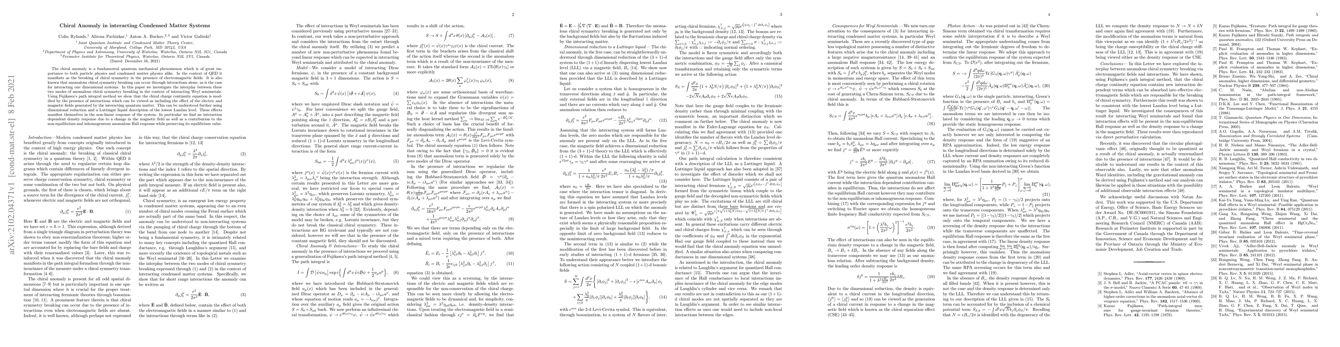 The chiral anomaly is a fundamental quantum mechanical phenomenon which is of great importance to both particle physics and condensed matter physics alike. In the context of QED it manifests as the breaking of chiral symmetry in the presence of electromagnetic fields. It is also known that anomalous chiral symmetry breaking can occur through interactions alone, as is the case for interacting one dimensional systems. In this paper we investigate the interplay between these two modes of anomalous chiral symmetry breaking in the context of interacting Weyl semimetals. Using Fujikawa's path integral method we show that the chiral charge continuity equation is modified by the presence of interactions which can be viewed as including the effect of the electric and magnetic fields generated by the interacting quantum matter. This can be understood further using dimensional reduction and a Luttinger liquid description of the lowest Landau level. These effects manifest themselves in the non-linear response of the system. In particular we find an interaction dependent density response due to a change in the magnetic field as well as a contribution to the non-equilibrium and inhomogeneous anomalous Hall response while preserving its equilibrium value.