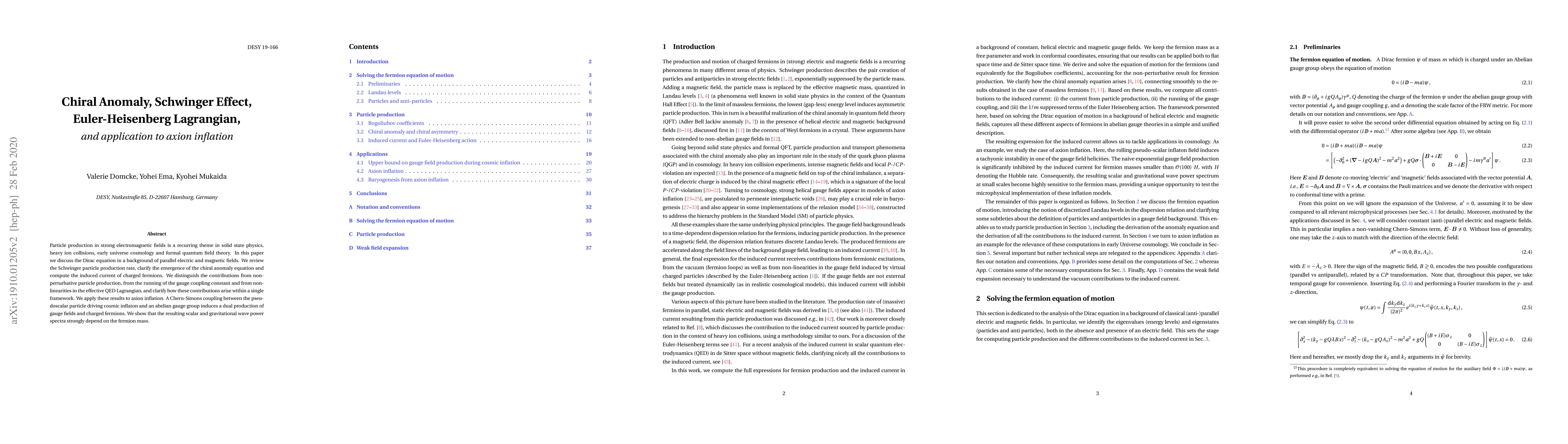 Particle production in strong electromagnetic fields is a recurring theme in solid state physics, heavy ion collisions, early universe cosmology and formal quantum field theory. In this paper we discuss the Dirac equation in a background of parallel electric and magnetic fields. We review the Schwinger particle production rate, clarify the emergence of the chiral anomaly equation and compute the induced current of charged fermions. We distinguish the contributions from non-perturbative particle production, from the running of the gauge coupling constant and from non-linearities in the effective QED Lagrangian, and clarify how these contributions arise within a single framework. We apply these results to axion inflation. A Chern-Simons coupling between the pseudoscalar particle driving cosmic inflaton and an abelian gauge group induces a dual production of gauge fields and charged fermions. We show that the resulting scalar and gravitational wave power spectra strongly depend on the fermion mass.