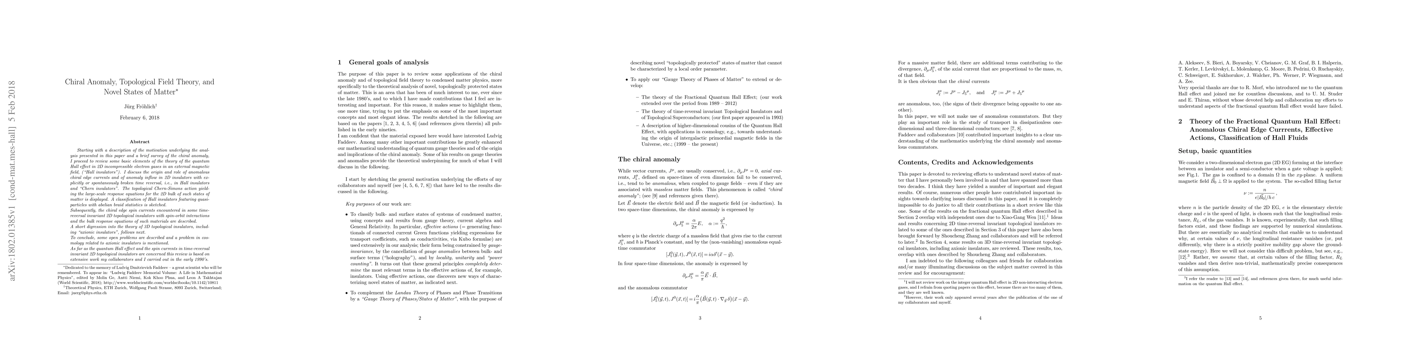 This paper reviews the connection between chiral anomaly, topological field theory, and novel states of matter, focusing on 2D Hall insulators and time-reversal invariant 2D topological insulators, with implications for understanding quantum Hall effect and axionic insulators.
