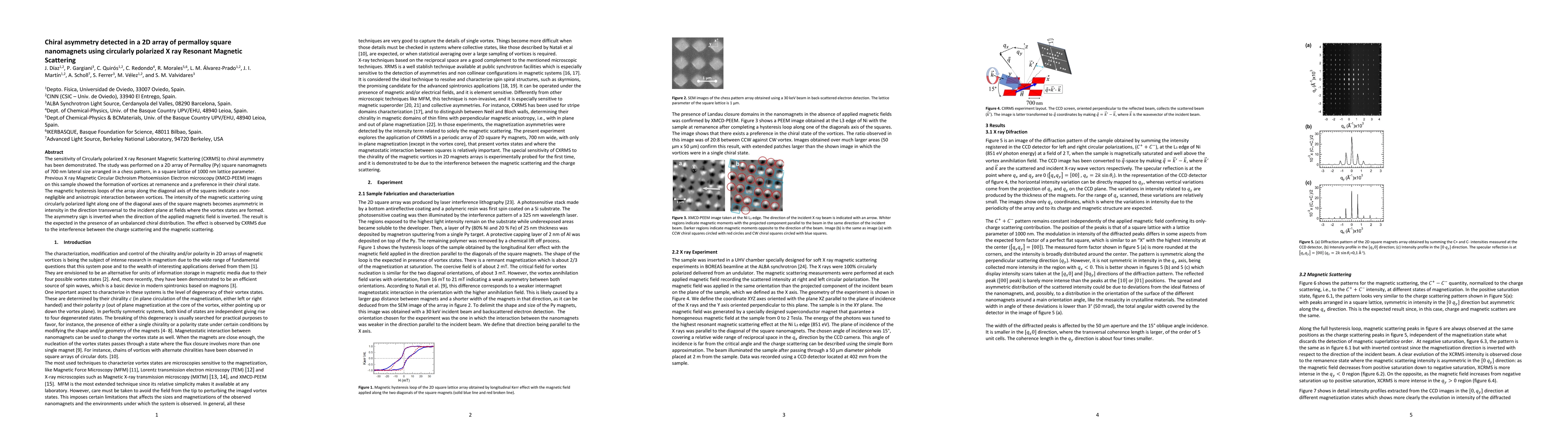 The sensitivity of Circularly polarized X ray Resonant Magnetic Scattering (CXRMS) to chiral asymmetry has been demonstrated. The study was performed on a 2D array of Permalloy (Py) square nanomagnets of 700 nm lateral size arranged in a chess lattice of 1000 nm lattice parameter. Previous X ray Magnetic Circular Dichroism Photoemission Electron microscopy (XMCD-PEEM) images on this sample showed the formation of vortices at remanence and a preference in their chiral state. The magnetic hysteresis loops of the array along the diagonal axis of the squares indicate a non-negligible and anisotropic interaction between vortices. The intensity of the magnetic scattering using circularly polarized light along one of the diagonal axes of the square magnets becomes asymmetric in intensity in the direction transversal to the incident plane at fields where the vortex states are formed. The asymmetry sign is inverted when the direction of the applied magnetic field is inverted. The result is the expected in the presence of an unbalanced chiral distribution. The effect is observed by CXRMS due to the interference between the charge scattering and the magnetic scattering.