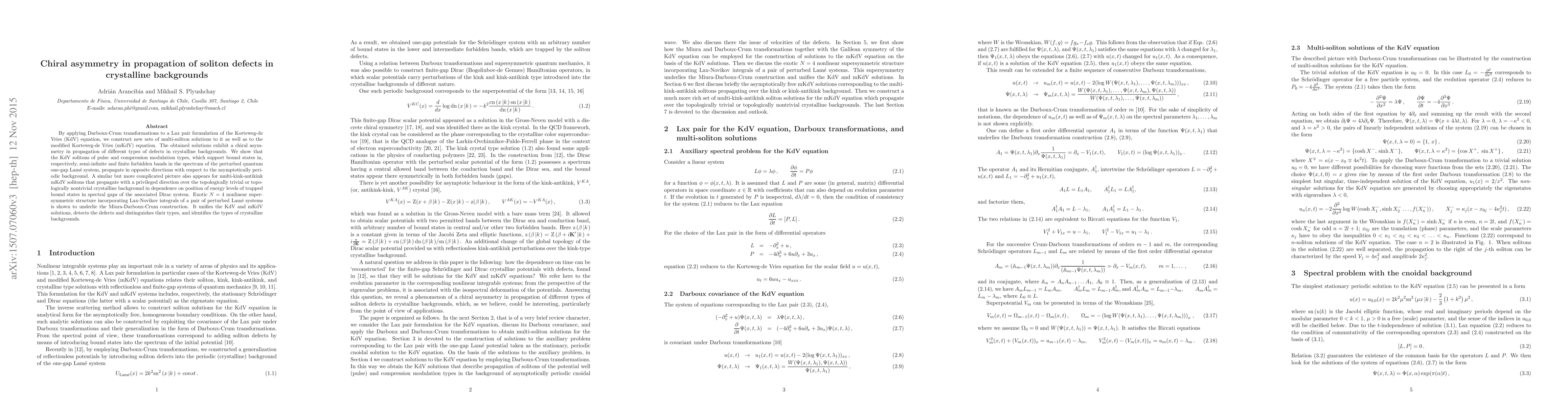 This paper constructs new multi-soliton solutions for the KdV and mKdV equations using Darboux-Crum transformations, revealing chiral asymmetry in defect propagation in crystalline backgrounds. The study identifies opposite directional propagation of KdV solitons and a complex directional preference for mKdV solitons, underpinned by an N=4 nonlinear supersymmetric structure.