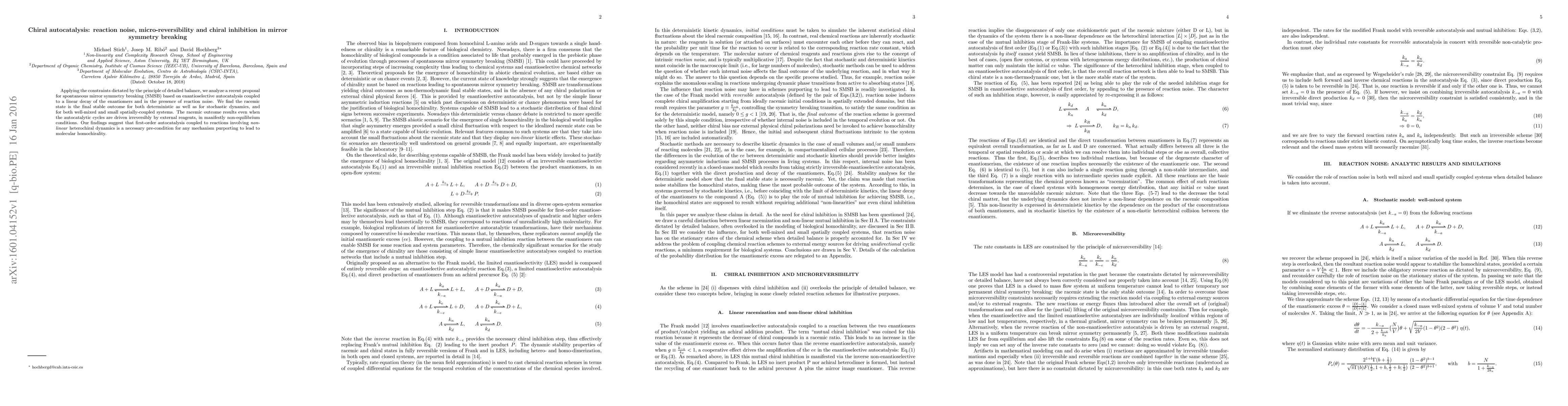 This paper investigates a proposed mechanism for spontaneous mirror symmetry breaking through chiral autocatalysis, finding that under various conditions, the racemic state remains stable. It concludes that first-order autocatalysis coupled to non-linear heterochiral dynamics is essential for achieving molecular homochirality.