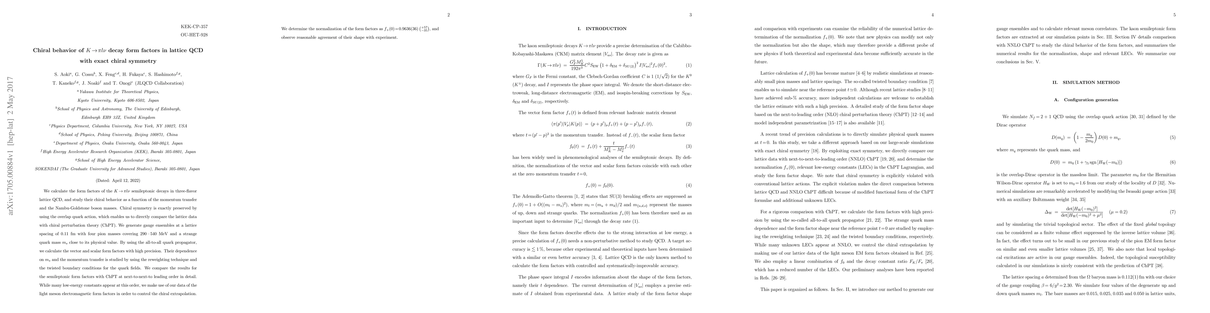 We calculate the form factors of the $K \to \pi l \nu$ semileptonic decays in three-flavor lattice QCD, and study their chiral behavior as a function of the momentum transfer and the Nambu-Goldstone boson masses. Chiral symmetry is exactly preserved by using the overlap quark action, which enables us to directly compare the lattice data with chiral perturbation theory (ChPT). We generate gauge ensembles at a lattice spacing of 0.11fm with four pion masses covering 290-540 MeV and a strange quark mass m_s close to its physical value. By using the all-to-all quark propagator, we calculate the vector and scalar form factors with high precision. Their dependence on m_s and the momentum transfer is studied by using the reweighting technique and the twisted boundary conditions for the quark fields. We compare the results for the semileptonic form factors with ChPT at next-to-next-to leading order in detail. While many low-energy constants appear at this order, we make use of our data of the light meson electromagnetic form factors in order to control the chiral extrapolation. We determine the normalization of the form factors as f_+(0) = 0.9636(36)(+57/-35), and observe reasonable agreement of their shape with experiment.